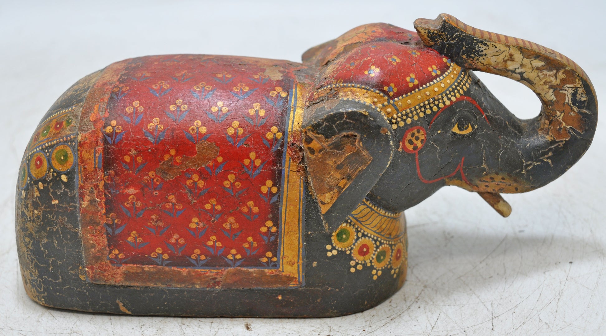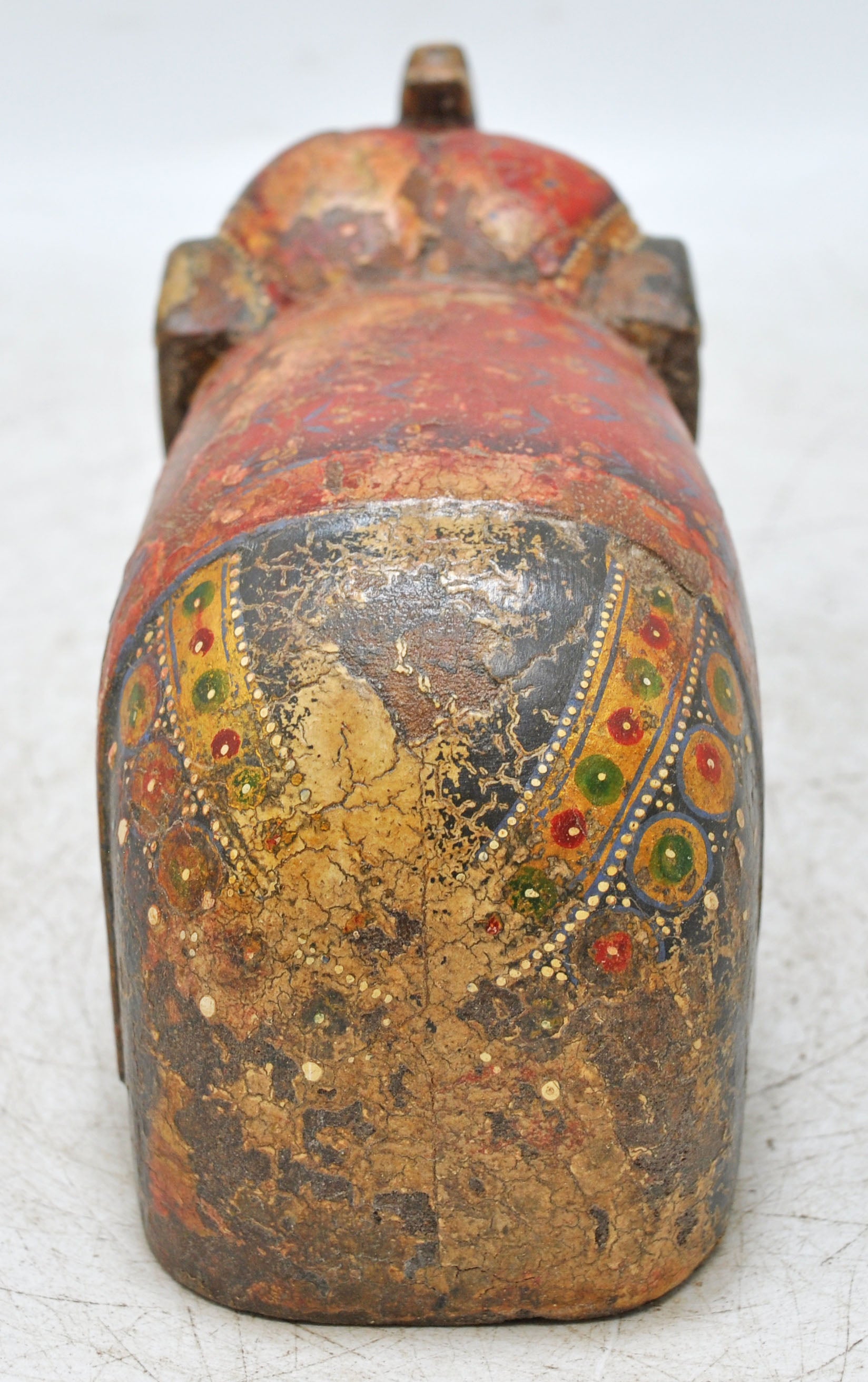 A graceful antique wooden elephant figurine, hand carved into an expressive form and enhanced with careful, fine hand-painted ornamentation. Its surface carries the gentle marks of age, developing a warm patina that adds history and character. The workmanship reflects traditional Indian artistry at its best. Still in good condition, it serves as a delightful decorative accent with enduring cultural significance.