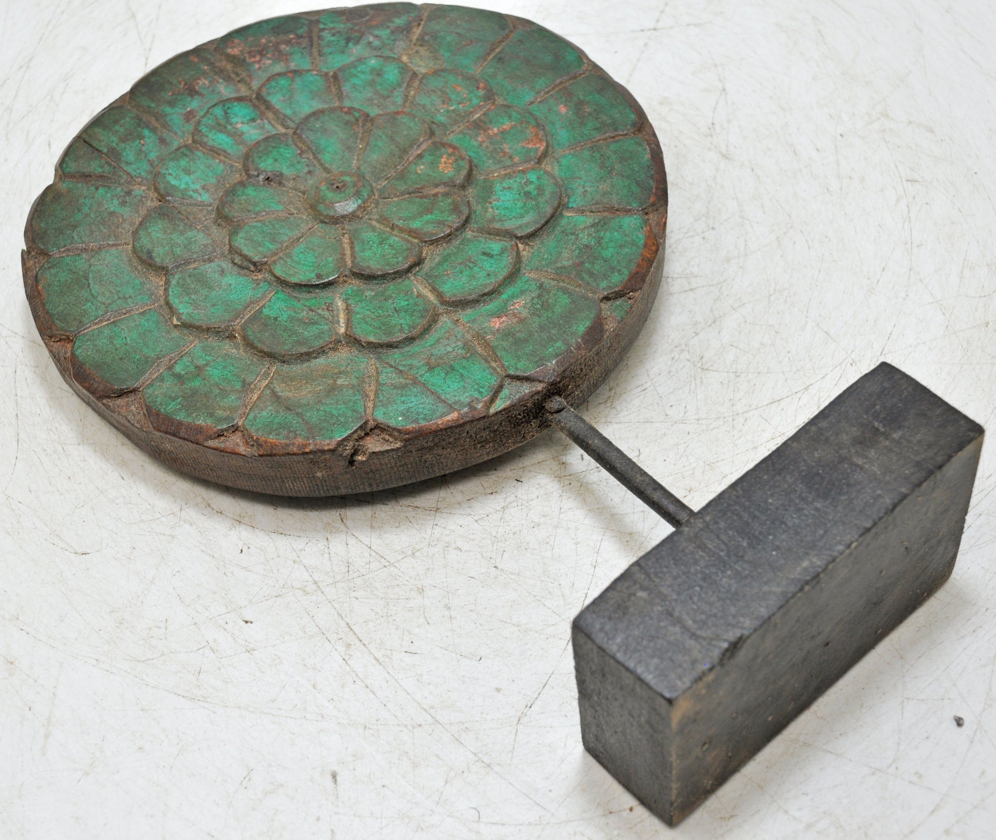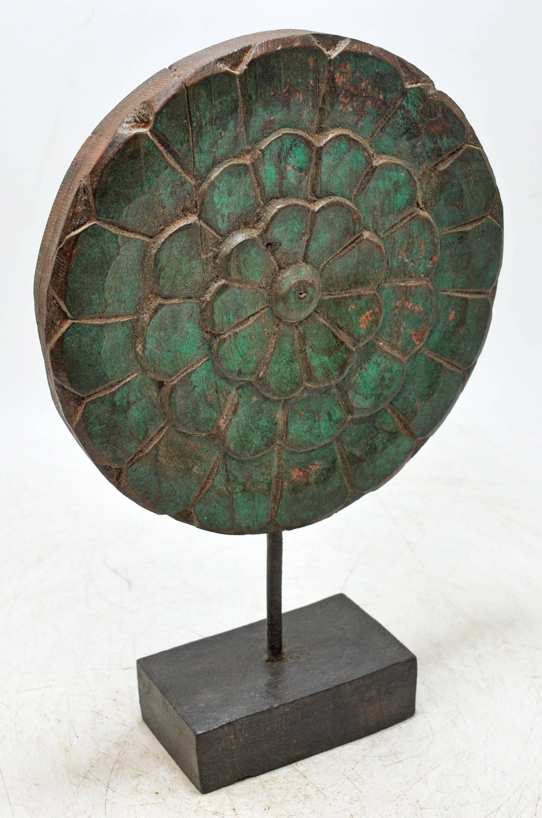 This vintage wooden flower carving panel has been meticulously hand carved, with every petal and leaf shaped with care and painted in a charming green rustic tone. Perfect for display on walls or mantels, it brings both artistry and color to interiors. The piece remains in good condition, with a rich patina that emphasizes its antique appeal. Originating from India, it demonstrates expert woodcarving techniques.