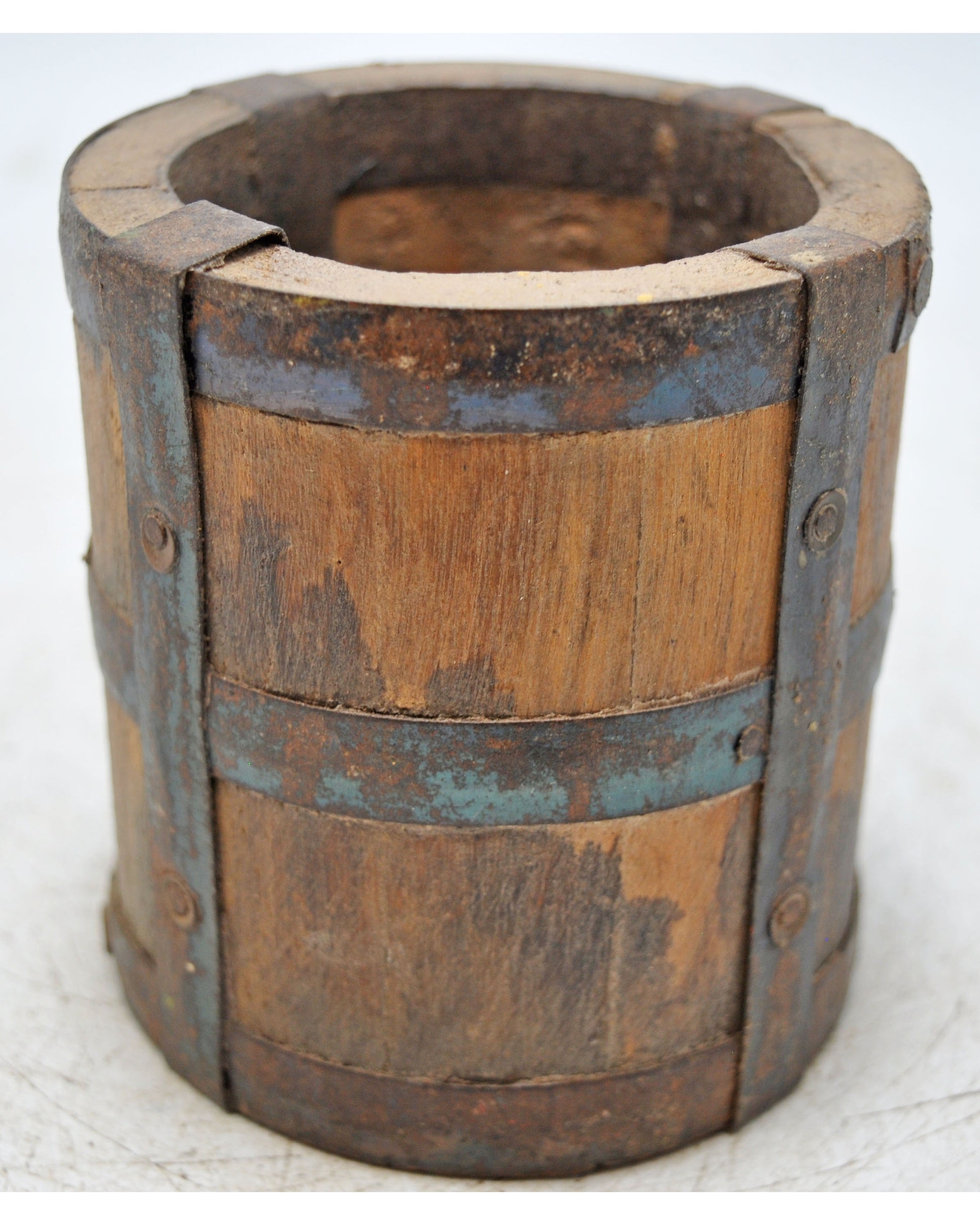 This is a good-looking vintage wooden grain measurement pot. It was originally crafted by hand in India. It’s designed to measure grains in the traditional way. It has a nice shape, is well-preserved, and has a rich patina. The pot is made of wood, but has metal fittings for durability.