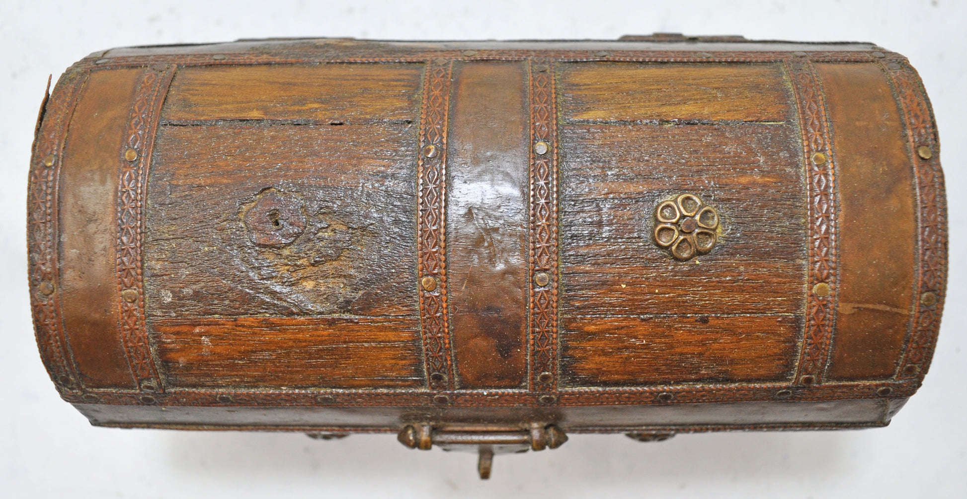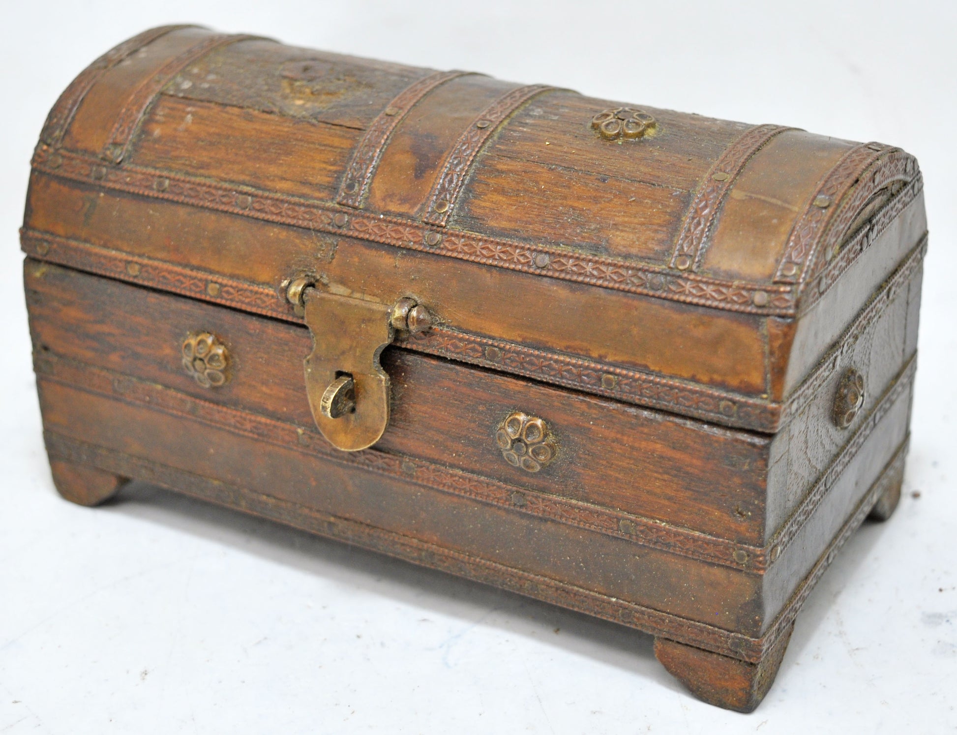 A nice looking old wooden small storage box. Hand crafted in a nice shape, with a half round top. Brass fitted on wood. Good condition and a rich patina. Origin India.