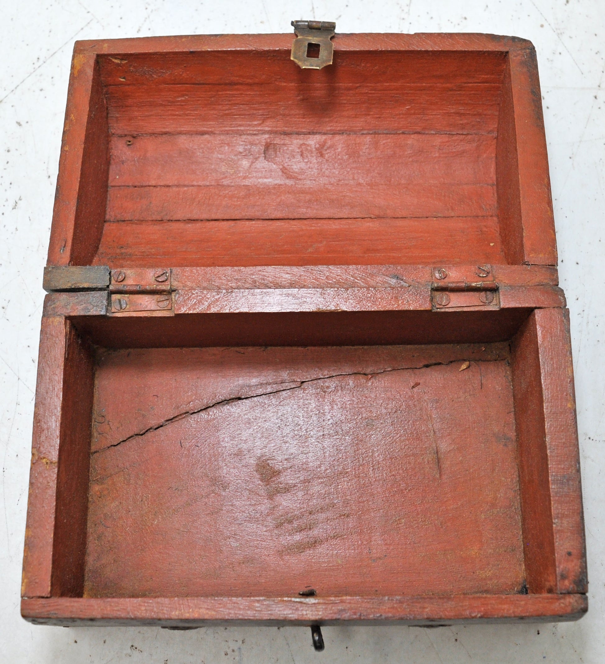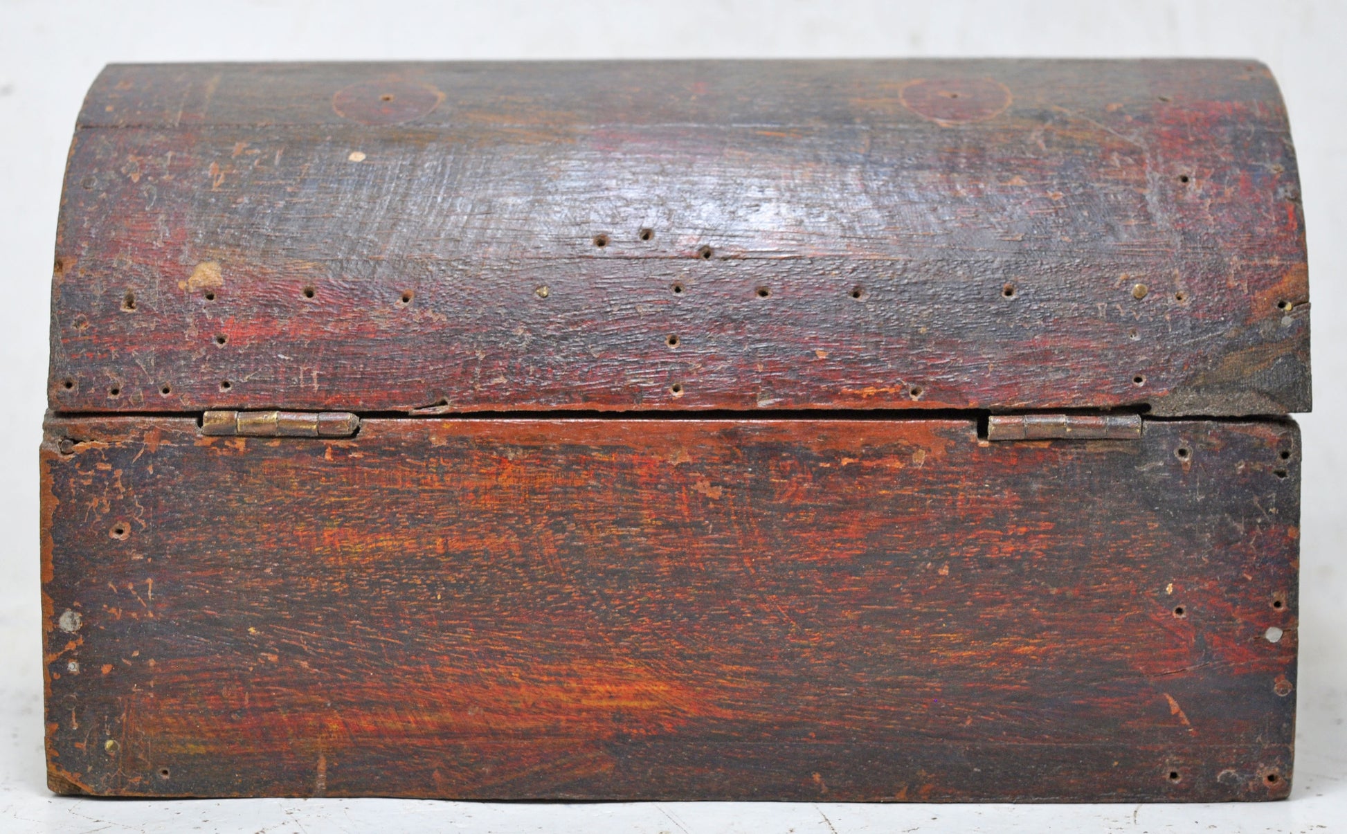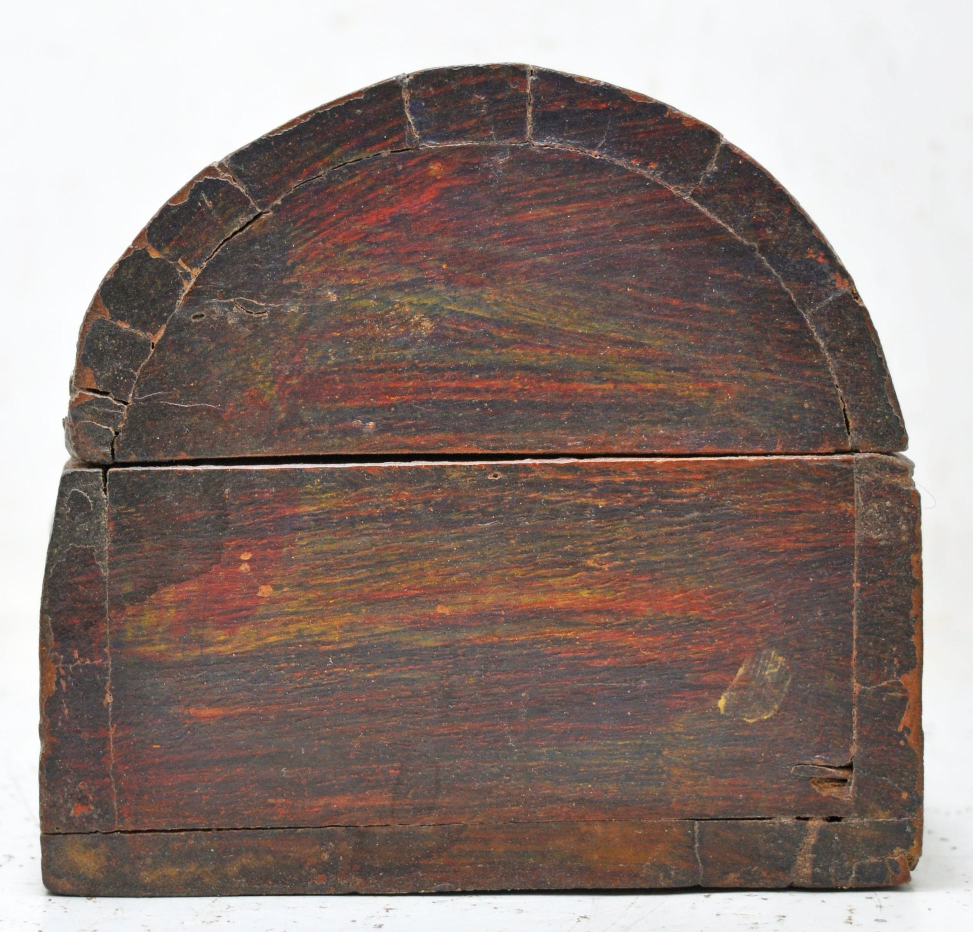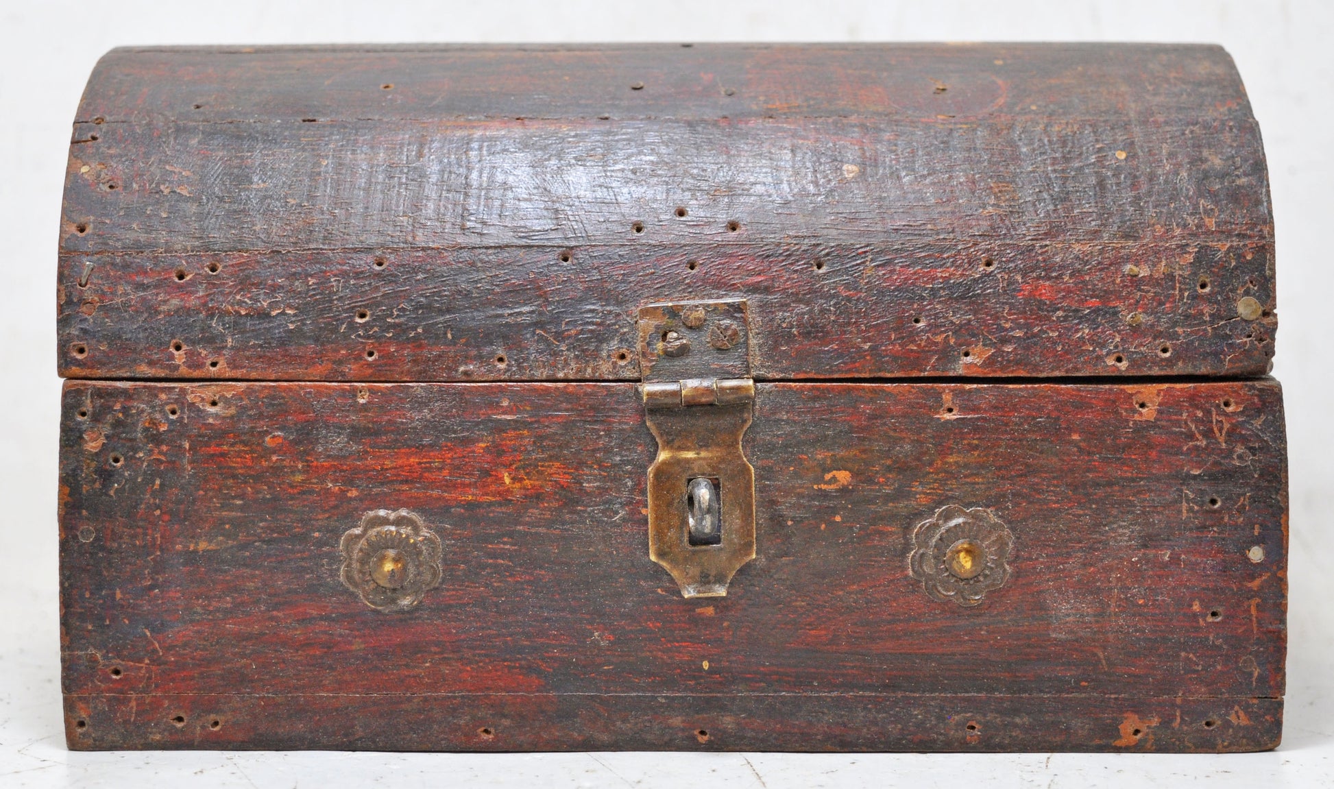 A nice looking old wooden storage box. Hand crafted in a nice shape, with a half round top. A little remains of original paint. Good condition and a rich patina. Origin India.