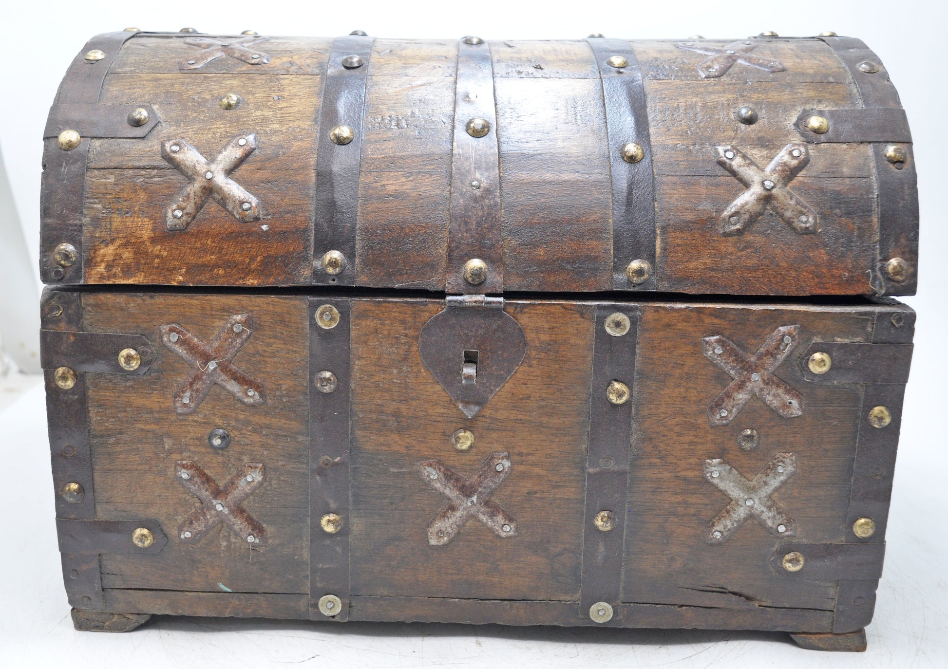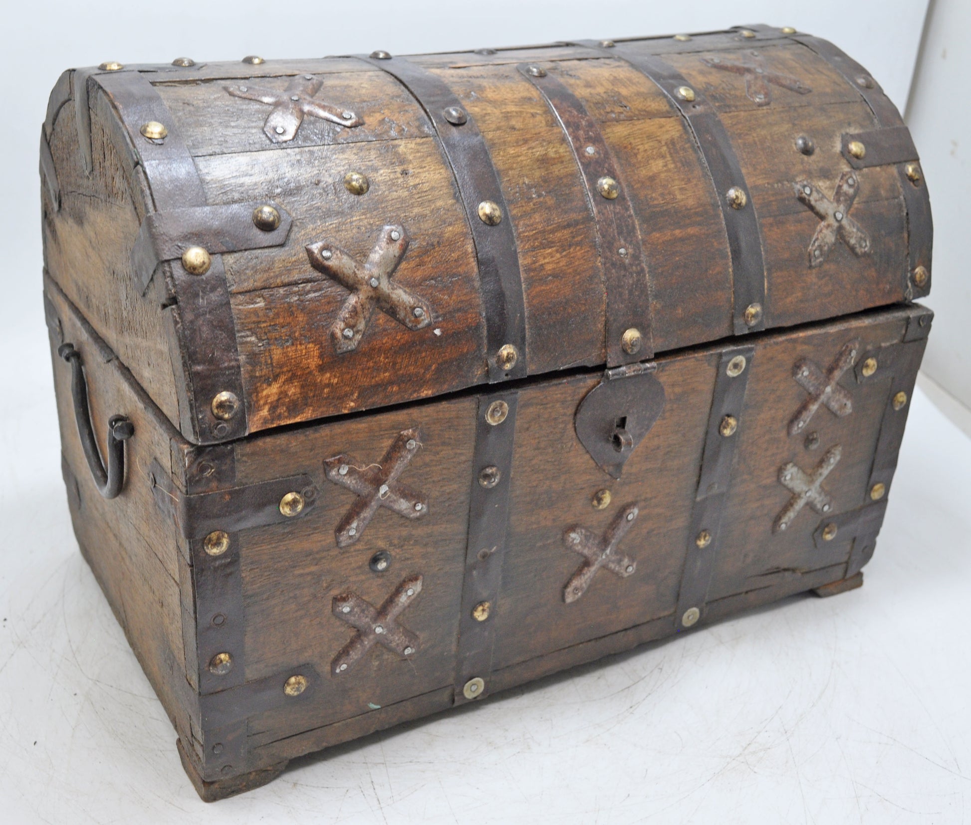 I am a seller located in Jodhpur, India, and I am selling a nice looking old wooden storage box. This storage box has a hand-crafted half-round top and metal fitted decorations on wood. The storage box is in good condition and has a rich patina.