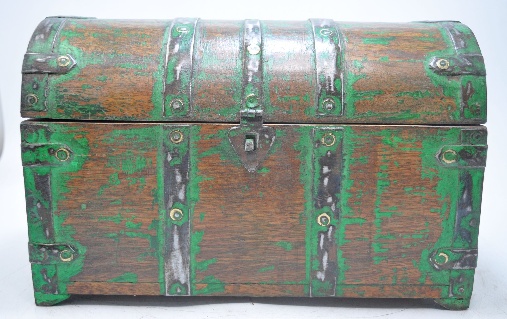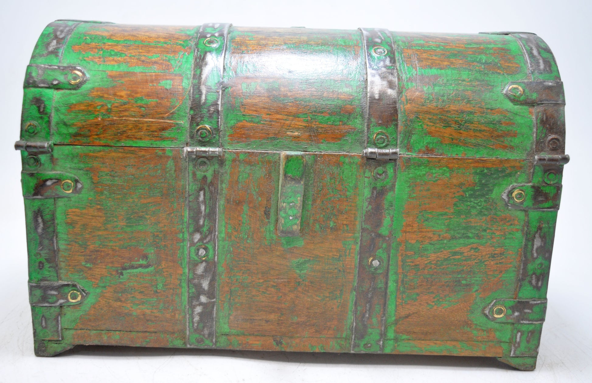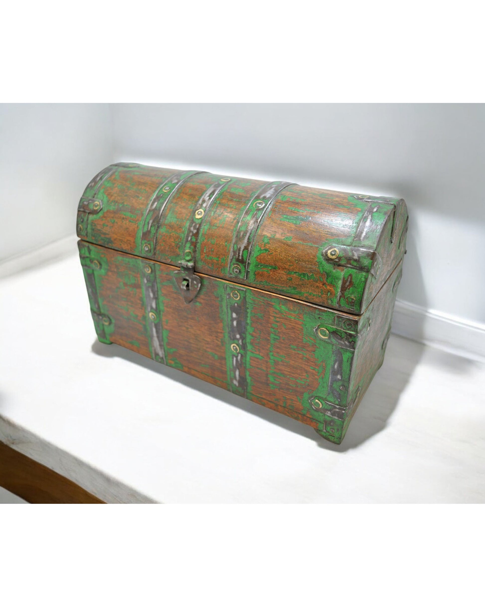 This exquisite vintage wooden storage box showcases a distinctive half-round top, enhanced by meticulously hand-crafted metal fittings that reflect exceptional artisanal skill. Carefully restored to preserve its rich patina, the rustic finish highlights the natural beauty and timeless character of the wood. Originating from India, this piece offers both practical storage and a refined decorative accent, making it an elegant addition to any space seeking heritage charm combined with functional artistry. Its sturdy construction ensures lasting use, while its unique design invites appreciation for traditional craftsmanship.