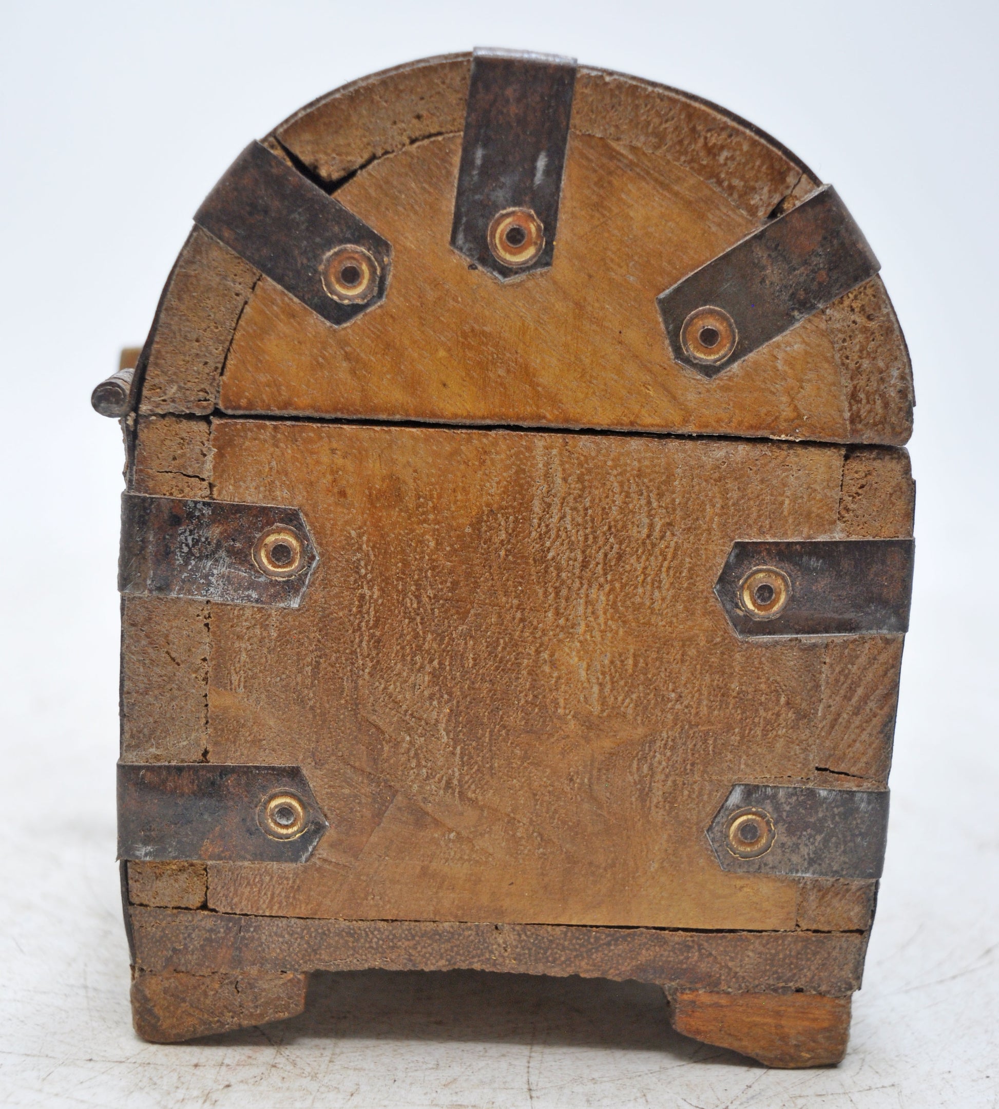 This is a nice looking old wooden storage box. I think it was hand crafted, as it has a half round top and metal fittings. It is in good condition with a rich patina, and it looks like it came from India.
