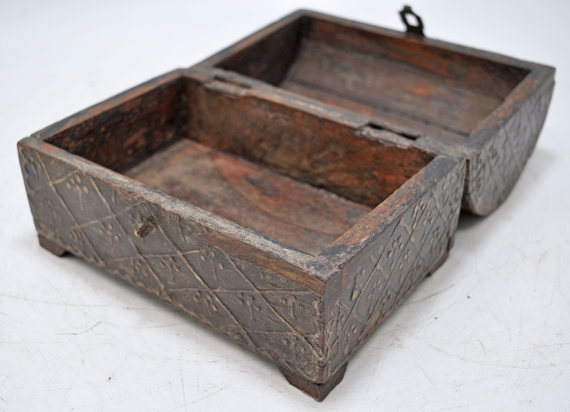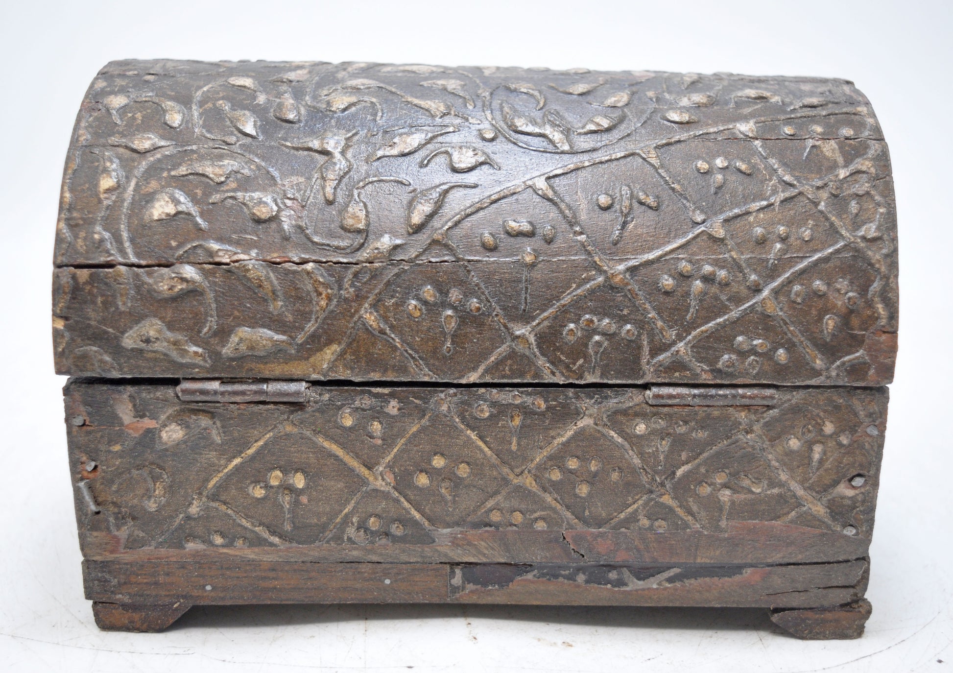 This storage box boasts an attractive vintage design, expertly handcrafted from aged wood with a half-round top and sturdy metal fittings. Its condition is excellent, with a beautifully aged patina. Made in India.