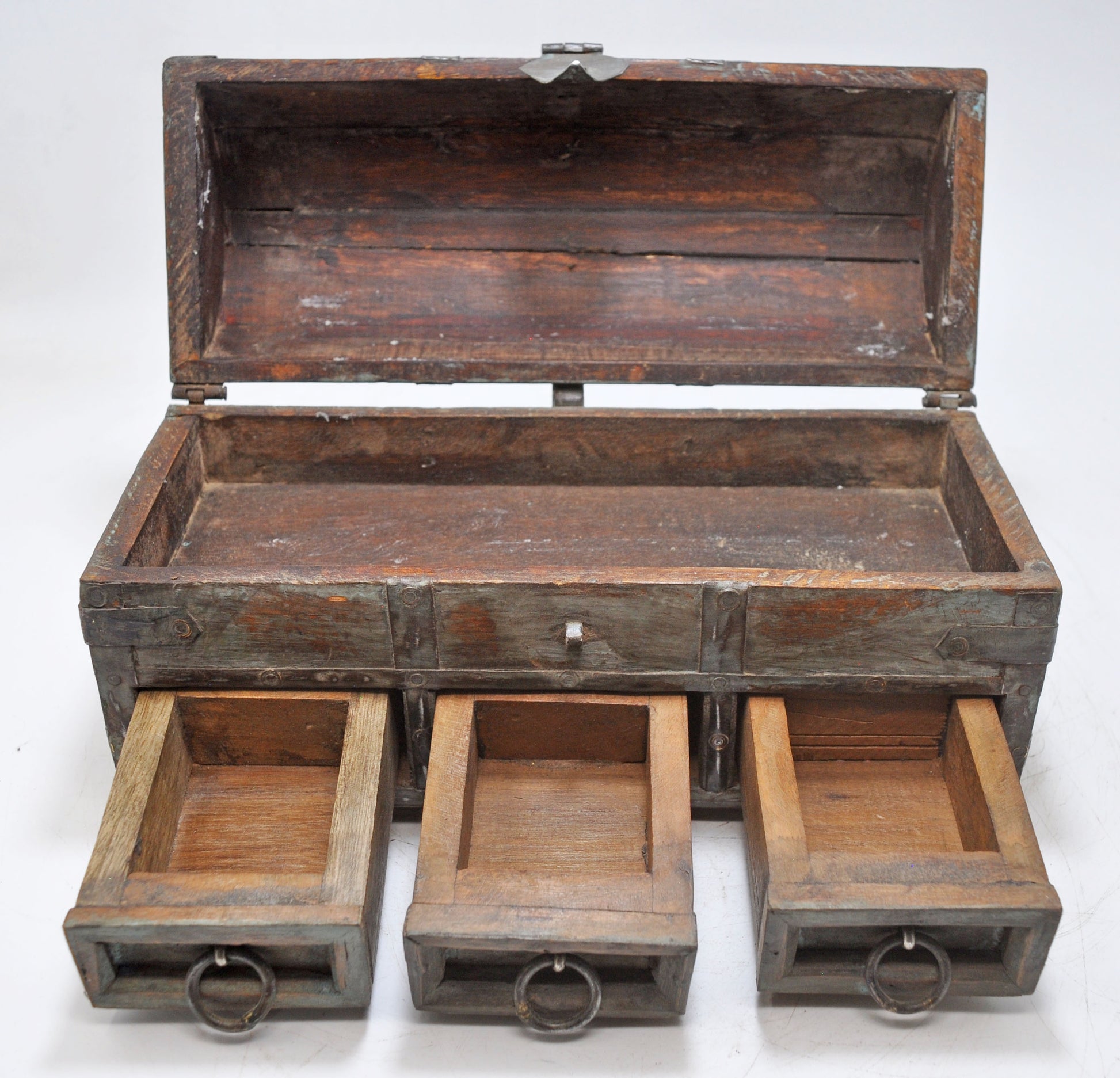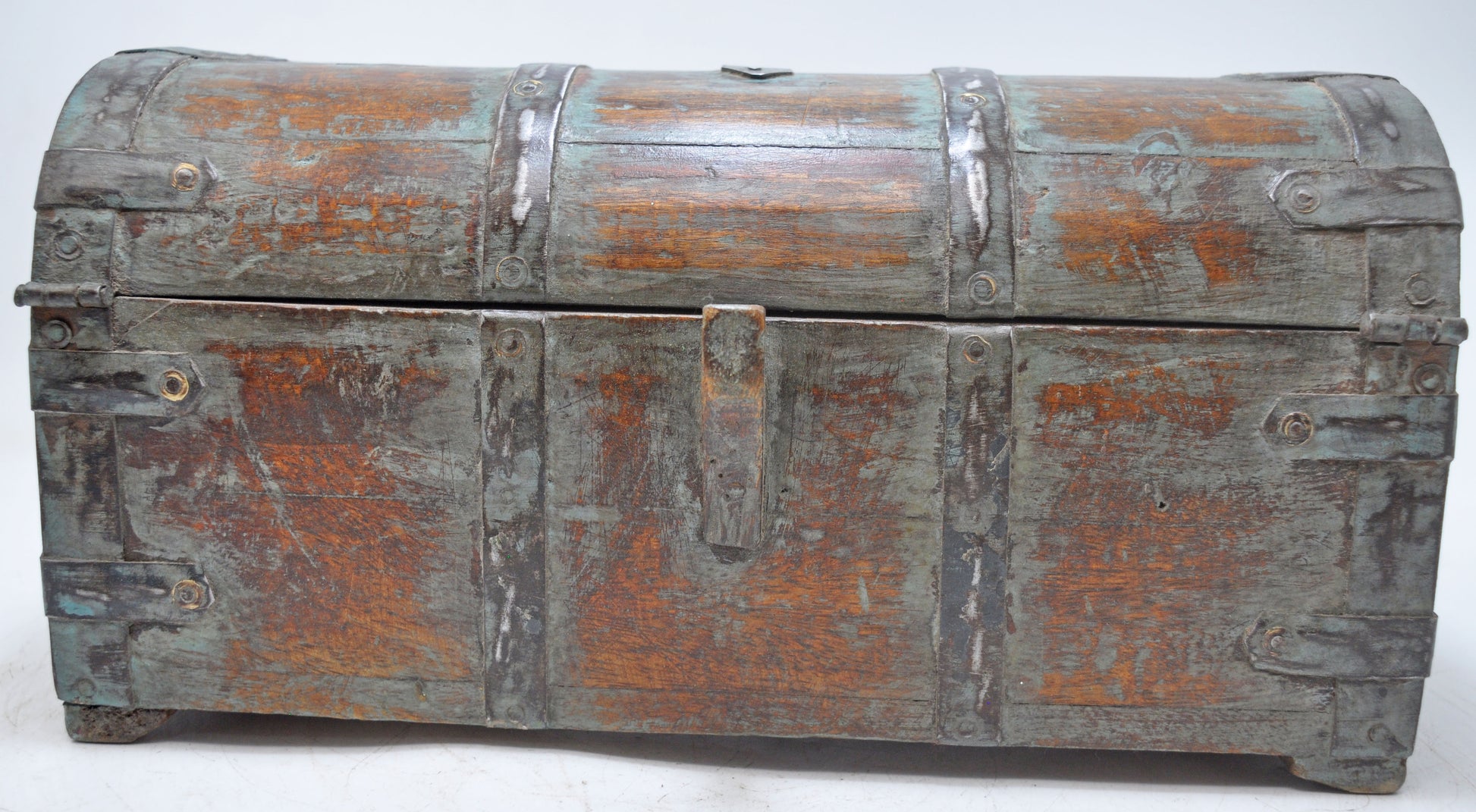 Experience the blend of artistry and history with this vintage wooden storage box, meticulously handcrafted in India. Its distinctive half round top and carefully designed metal accents offer both elegance and functional charm. The rustic color finish captures the essence of freshly restored wood, enhancing the rich patina that speaks to its storied past. In excellent condition, this piece not only provides practical storage but also serves as a sophisticated decorative element, adding warmth and character to any space. Embrace the timeless beauty and craftsmanship embodied in this unique artifact.