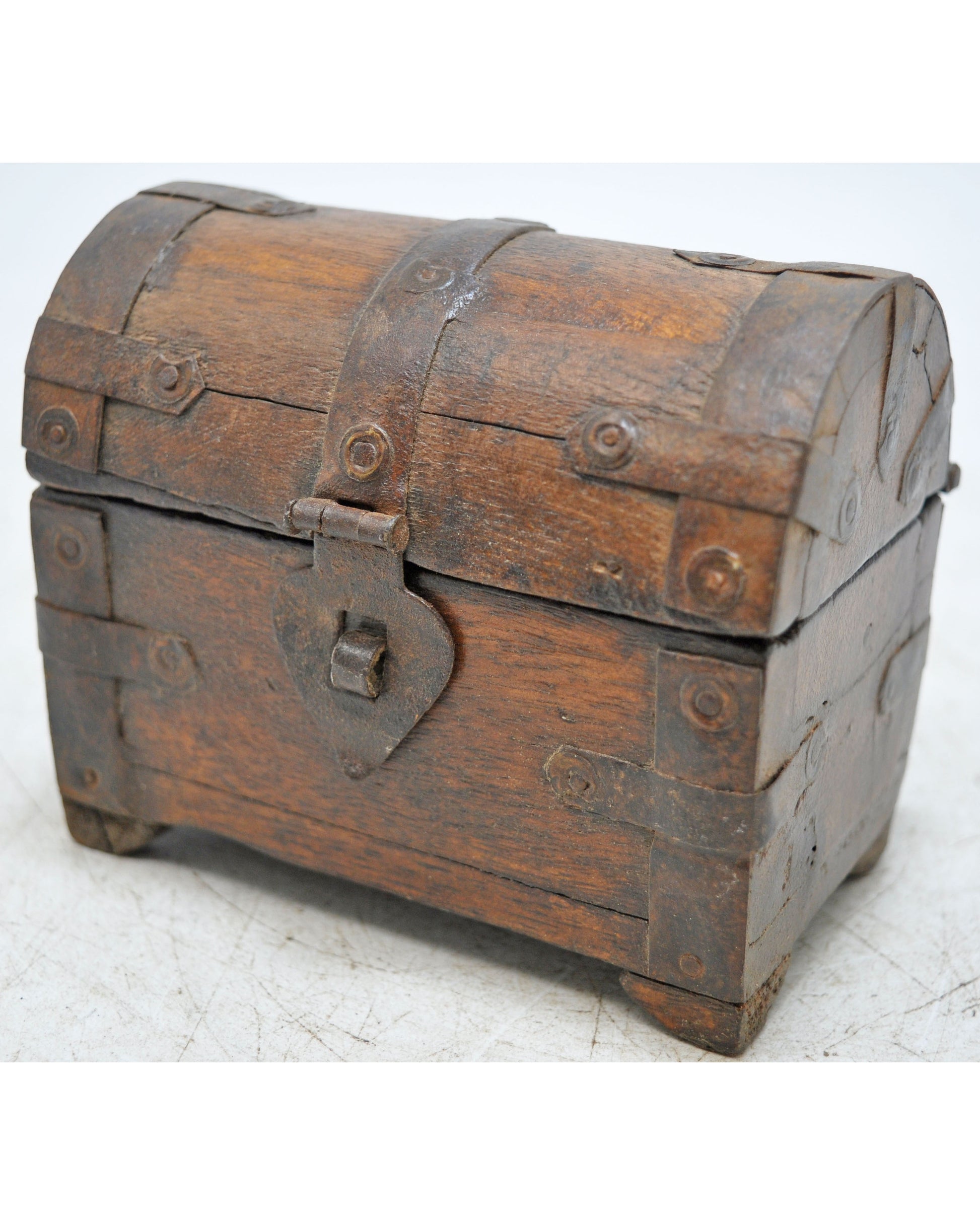 The Vintage Wooden Half Round Top Storage Box is a nice-looking old wooden storage box. It is hand crafted, with a half-round top. It features metal fittings on wood and a rich patina. It's in good condition. Origin: India.