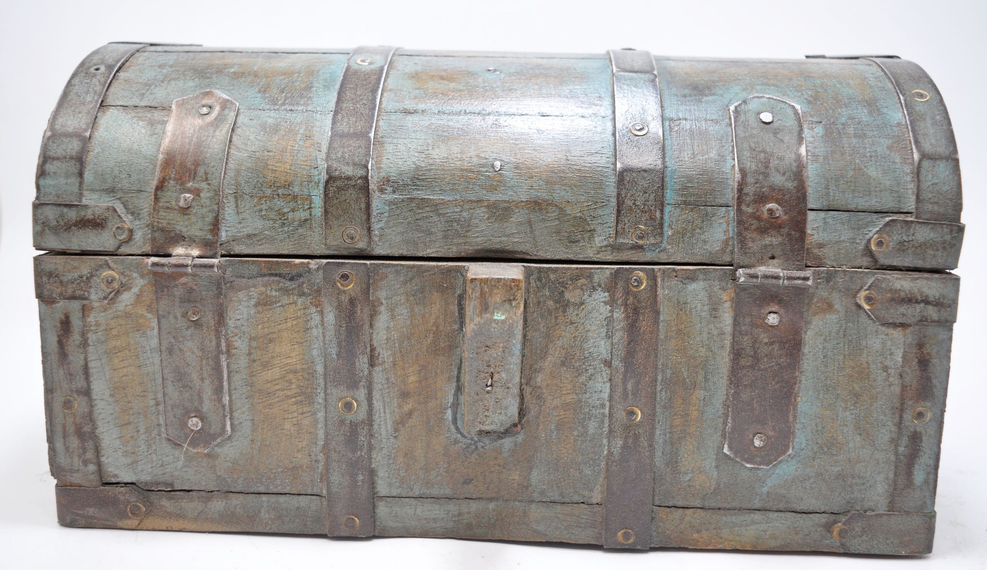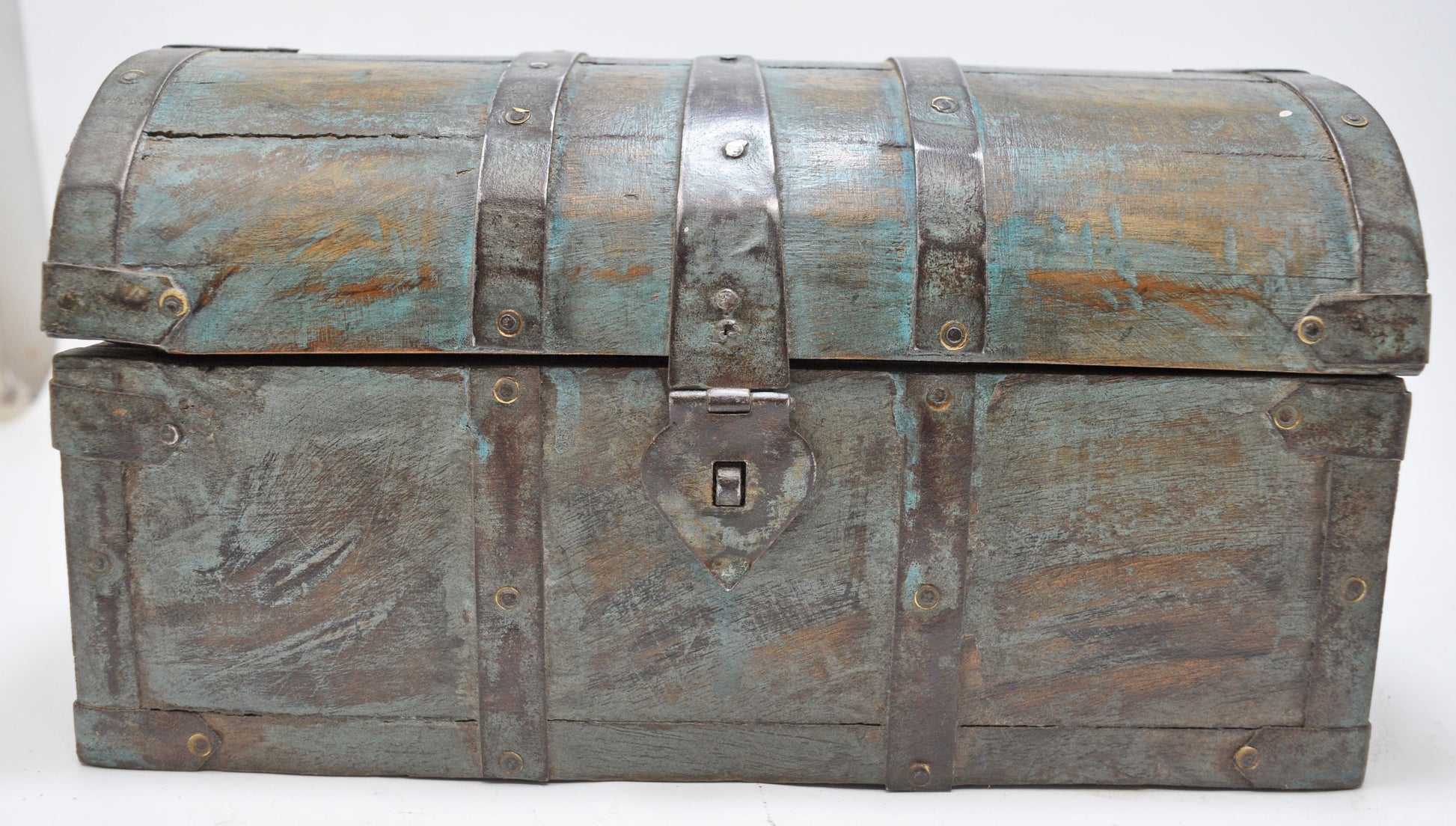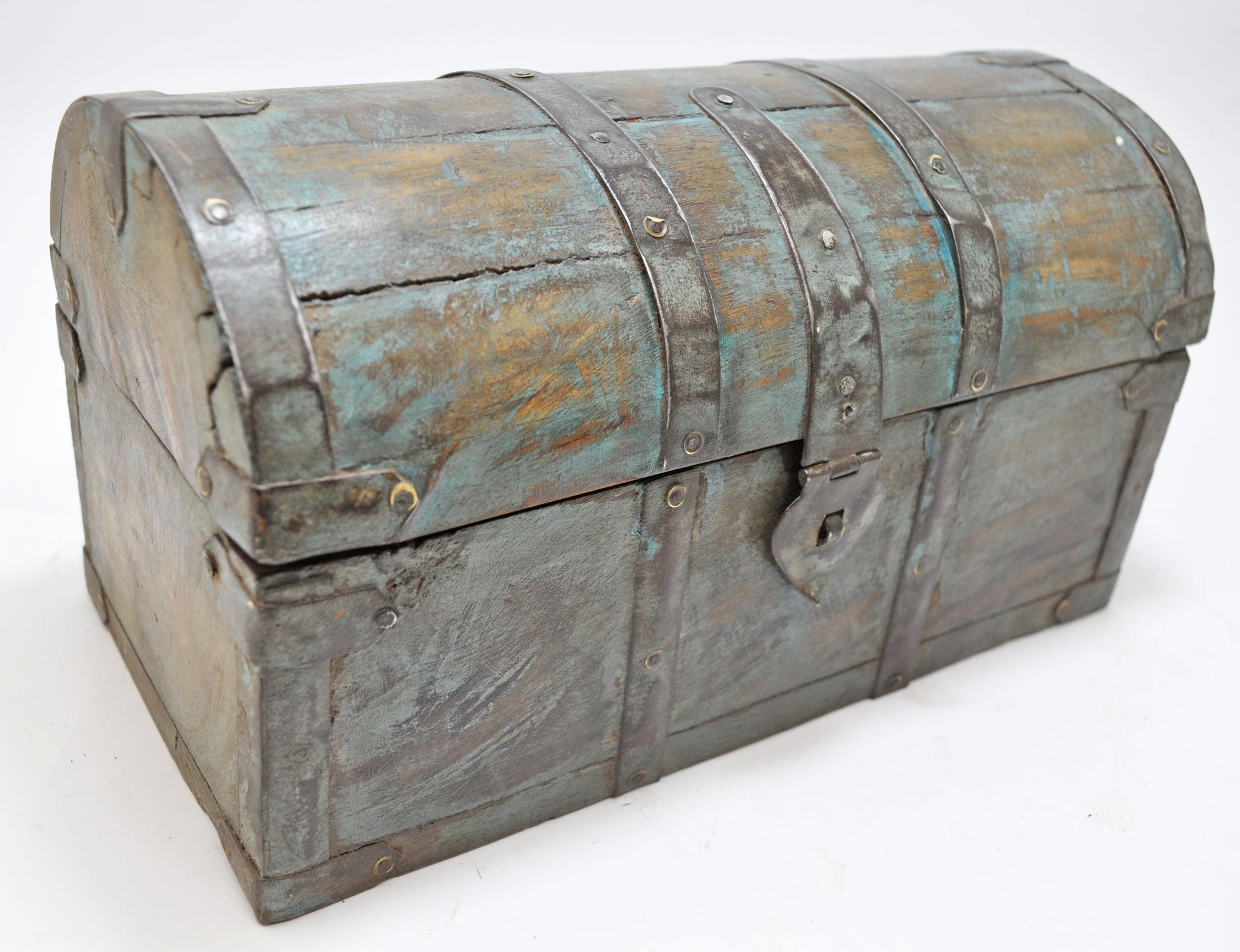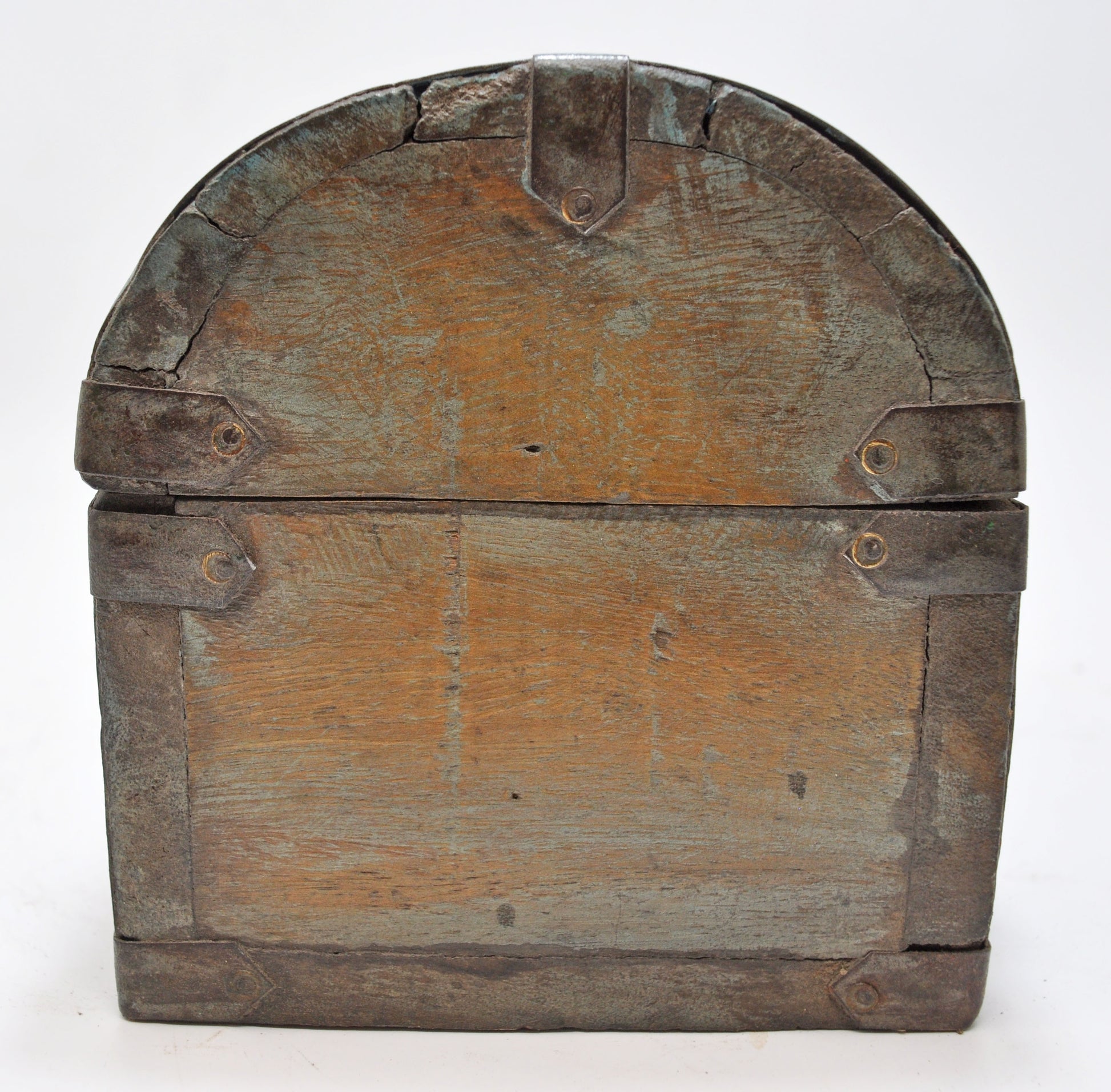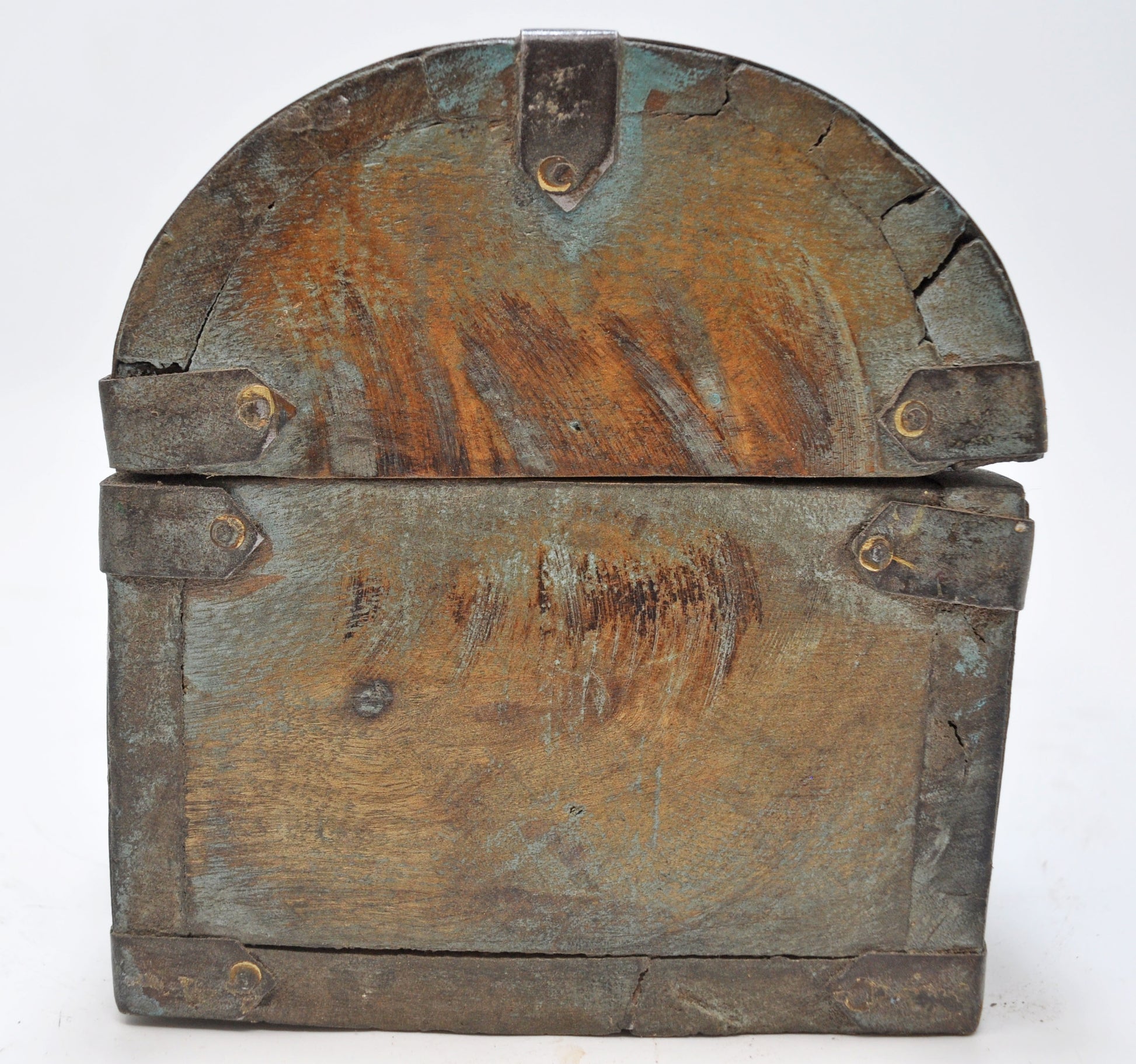 This vintage wooden storage box features a distinctive half-round top, meticulously hand-crafted to blend traditional craftsmanship with functional design. The wood is complemented by metal fittings that enhance both durability and aesthetic appeal. Finished in a rustic color, the box exhibits a rich patina that speaks to its age and careful preservation. Originating from India, it reflects authentic artisanal techniques and attention to detail, making it a unique piece for collectors or those seeking a stylish storage solution with historical character. Its sturdy construction ensures reliable use while adding a touch of vintage charm to any space.