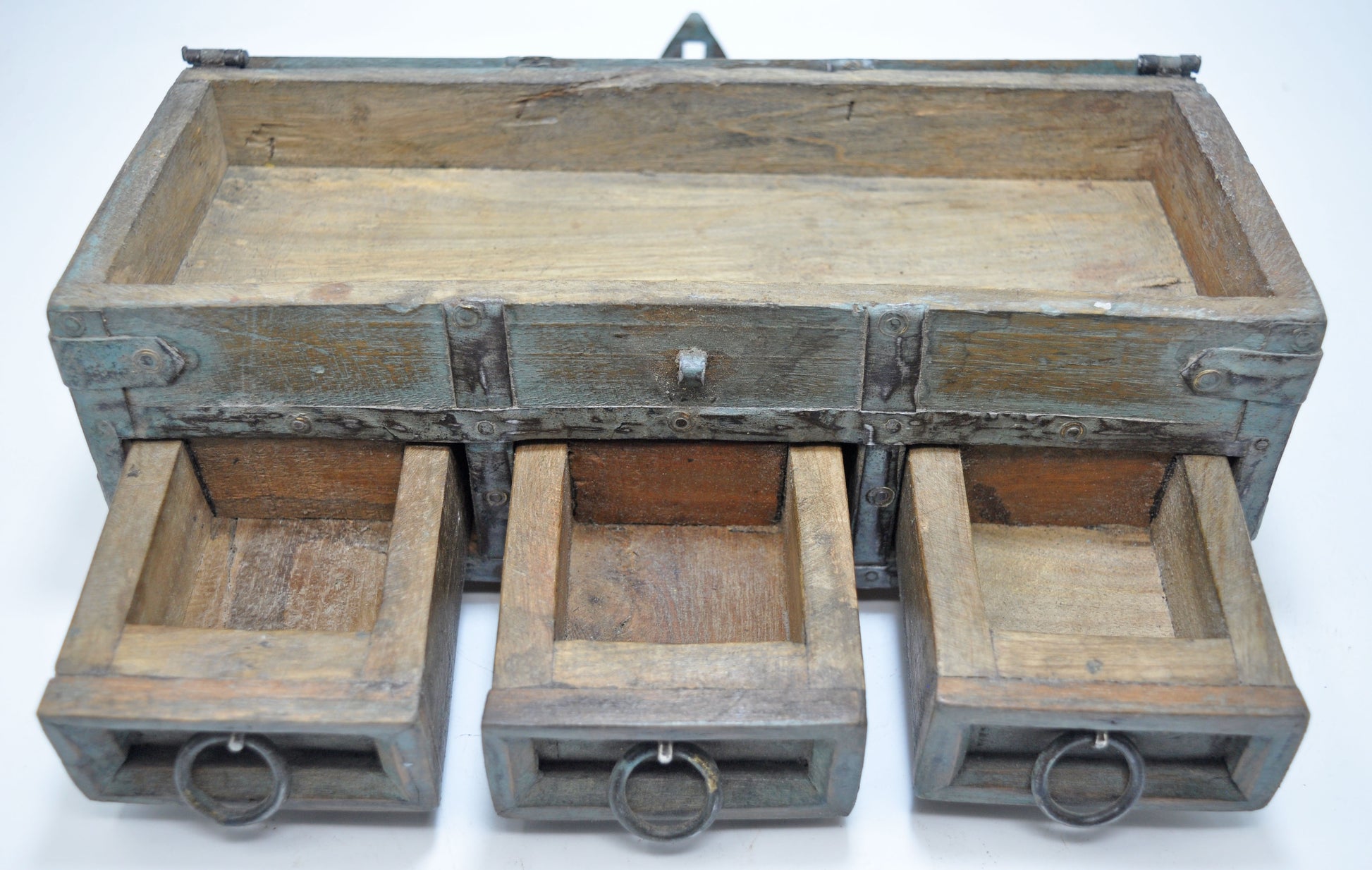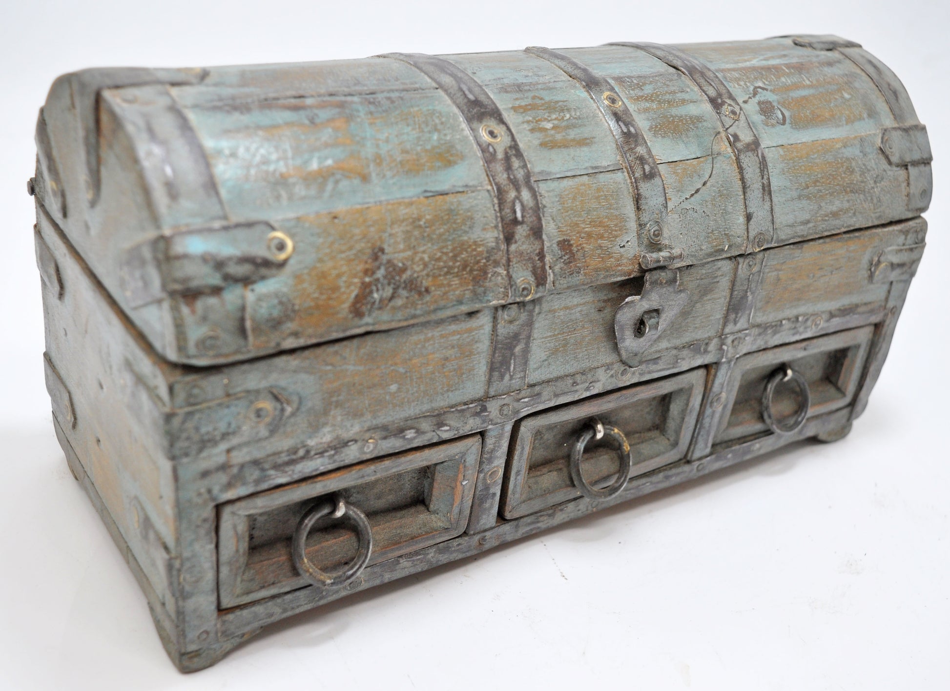 This vintage wooden storage box is expertly hand-crafted in India, showcasing traditional woodworking skills. Made from sturdy wood, it features a distinctive half-round top that adds character and uniqueness. The box includes two practical drawers for organized storage, enhanced by durable metal fittings that ensure longevity. Its rustic color finish, combined with a rich patina developed over time, highlights its authentic antique appeal. In good condition, this piece not only offers functional storage but also serves as a charming decorative item, perfect for those who appreciate handcrafted heritage and timeless design.
