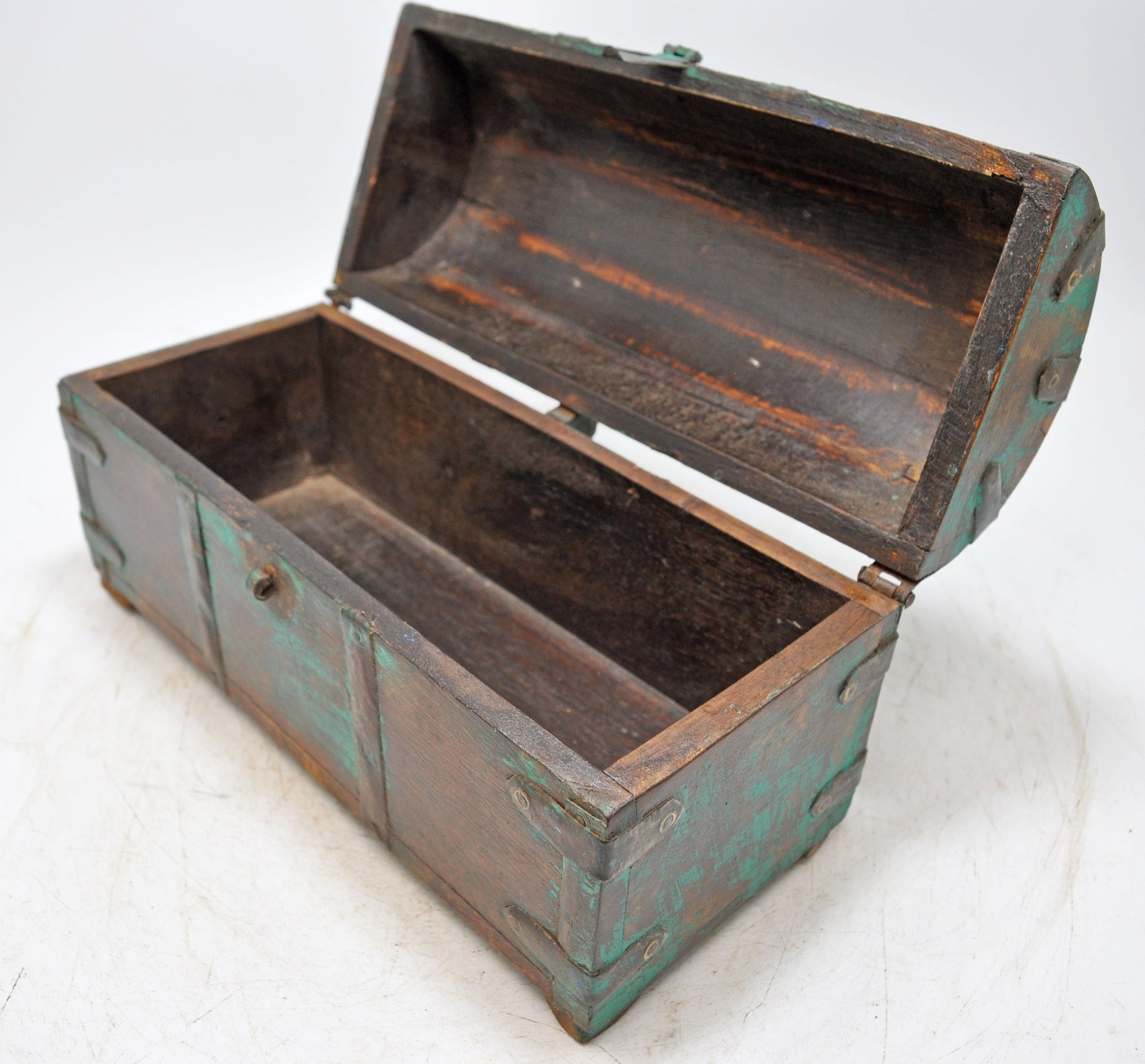 A nice looking old wooden storage box. Hand crafted with a half round top. Metal fitted on wood. Rustic polychrome green color. Good condition and a rich patina. Origin India.