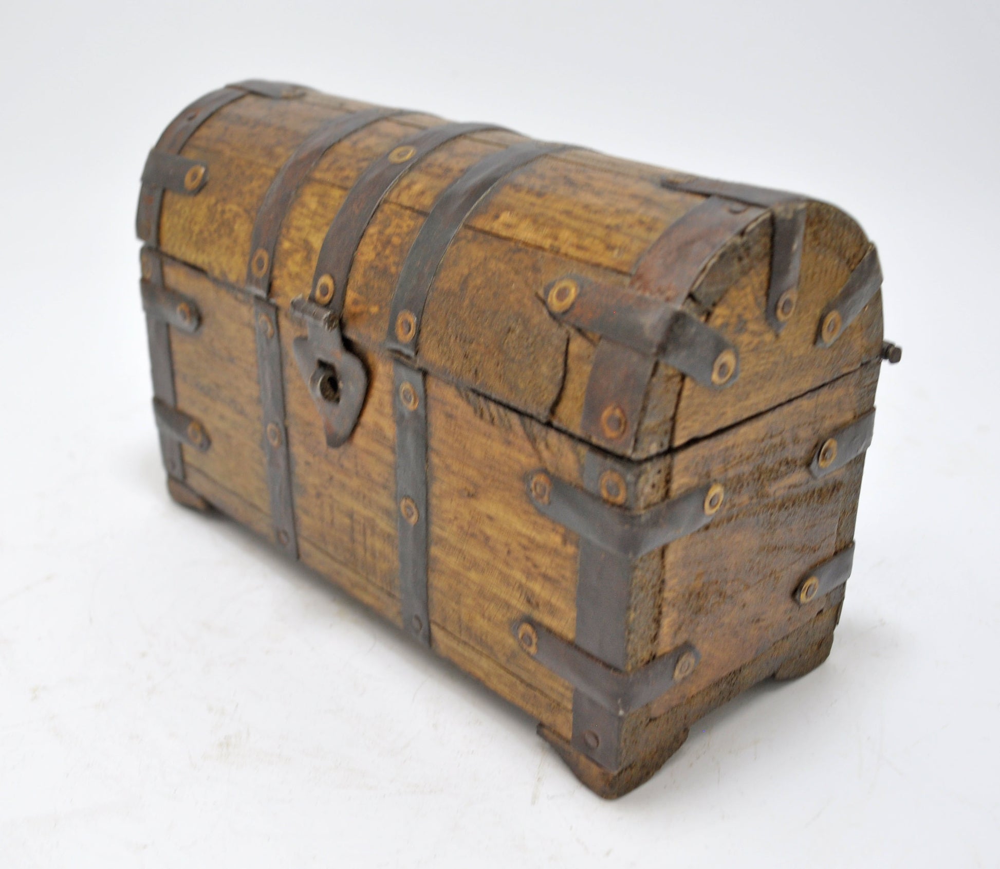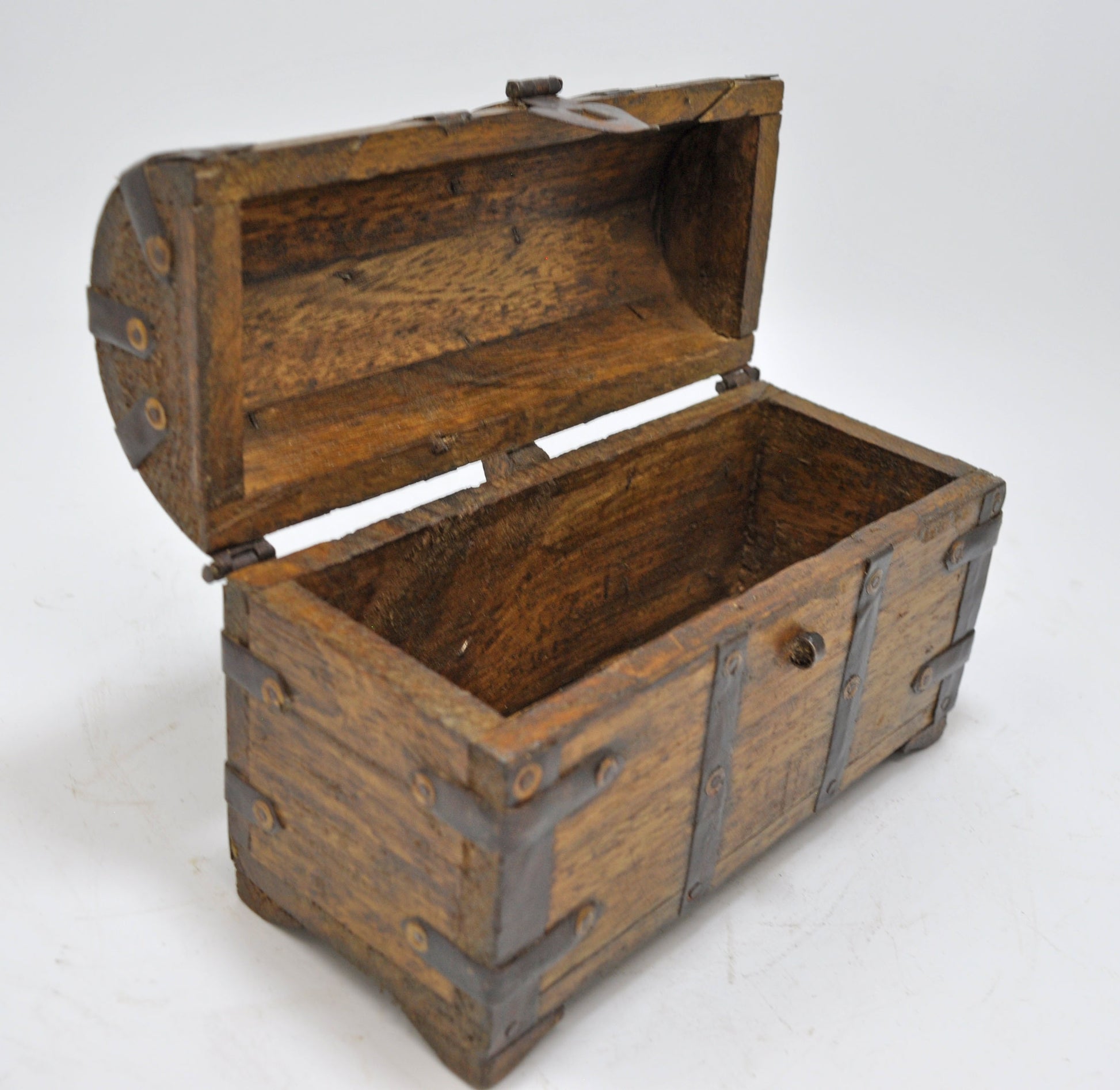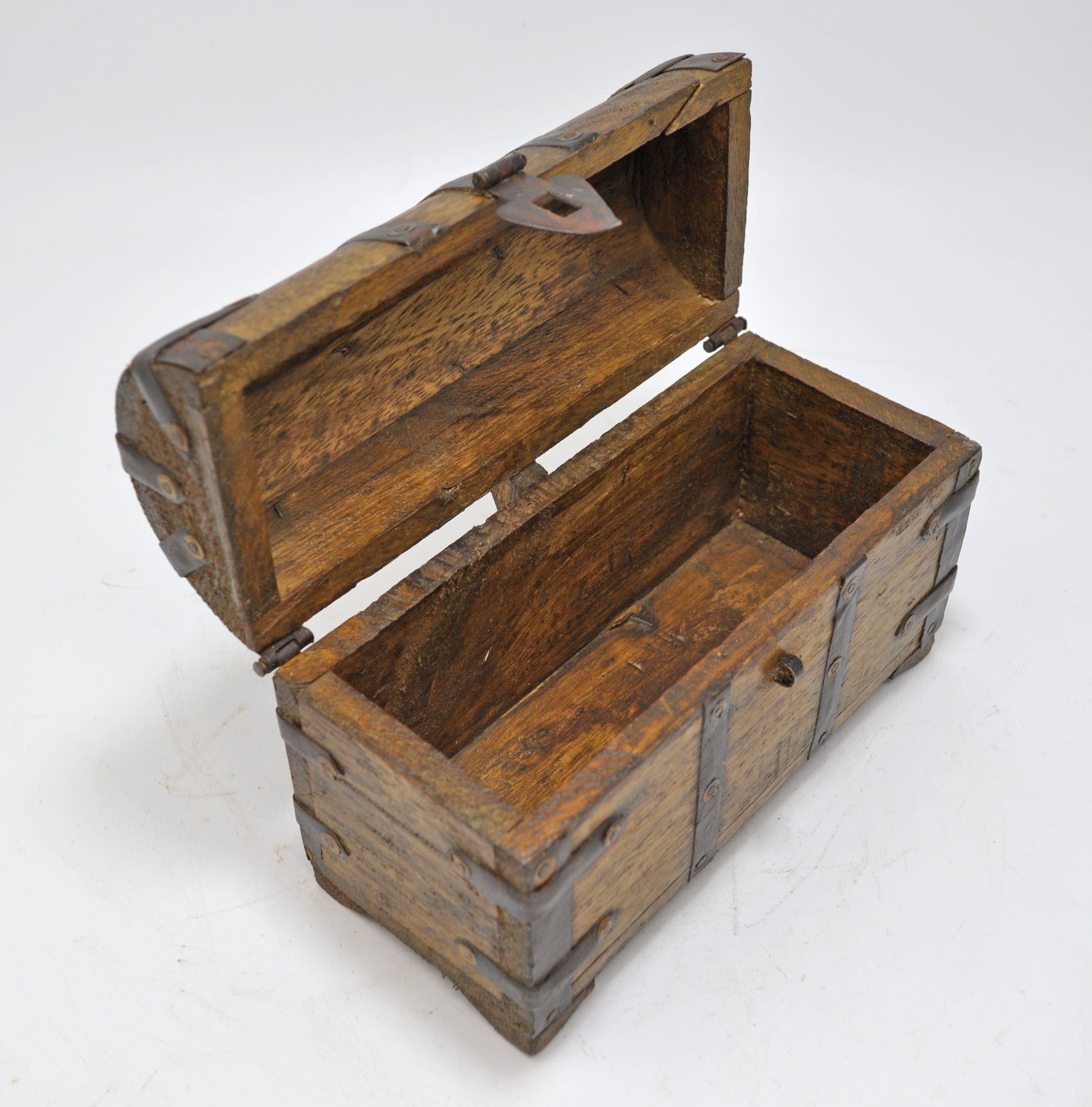 A nice looking old wooden storage box. Hand crafted in a nice shape. Metal fitted decoration on wood. Good condition and a rich patina. Origin India.