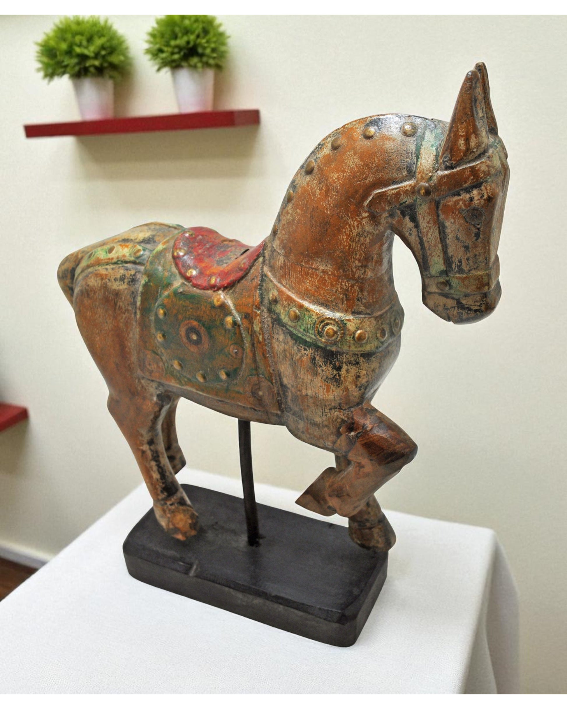An exquisite antique wooden horse figurine, meticulously hand-carved into a noble and lifelike form. Elegantly mounted upon a display stand, this piece is in very good condition and showcases a warm, aged patina that speaks to its history and heritage. Crafted in India, it serves as a distinguished decorative object or collectible, evoking the charm of traditional craftsmanship from a bygone era.