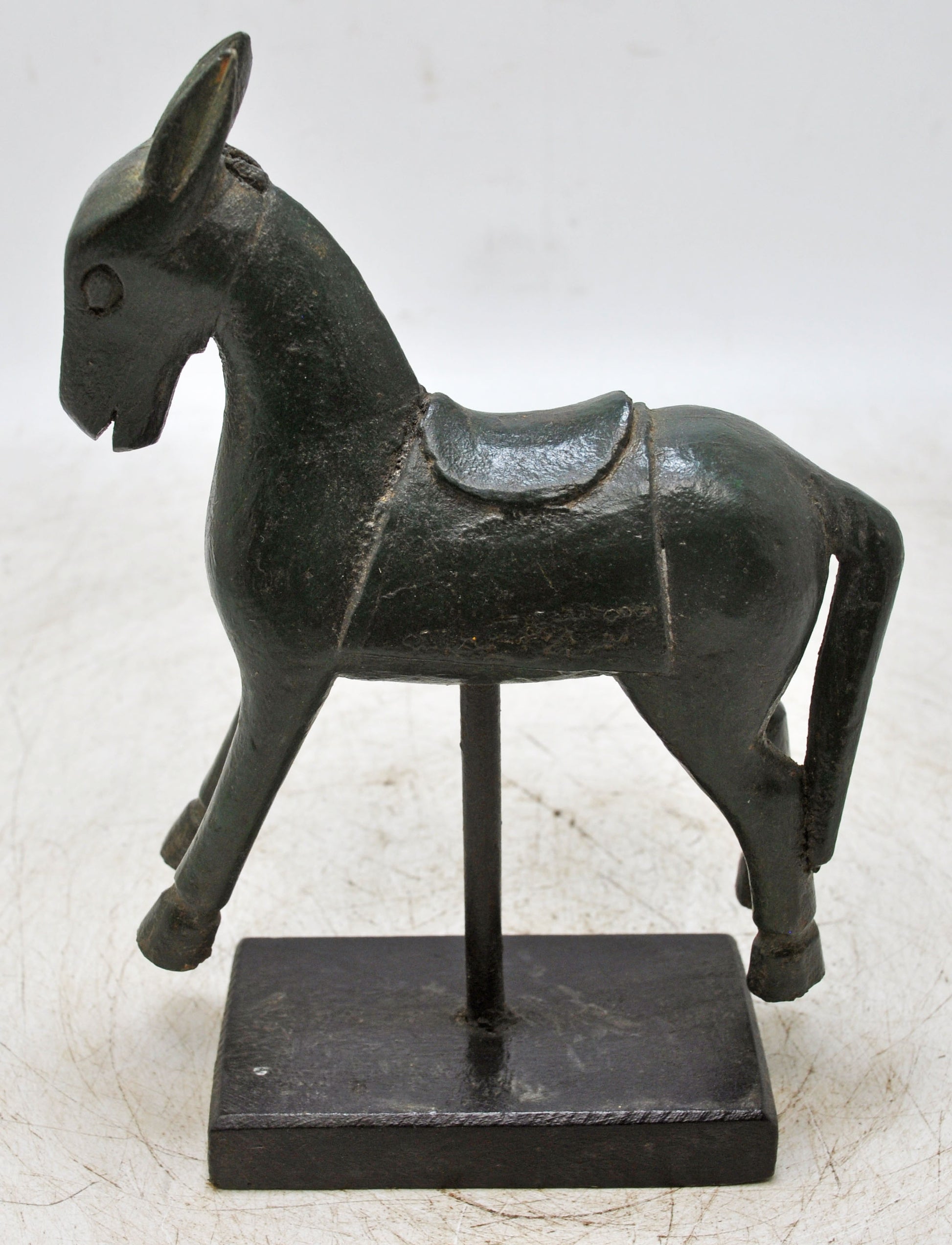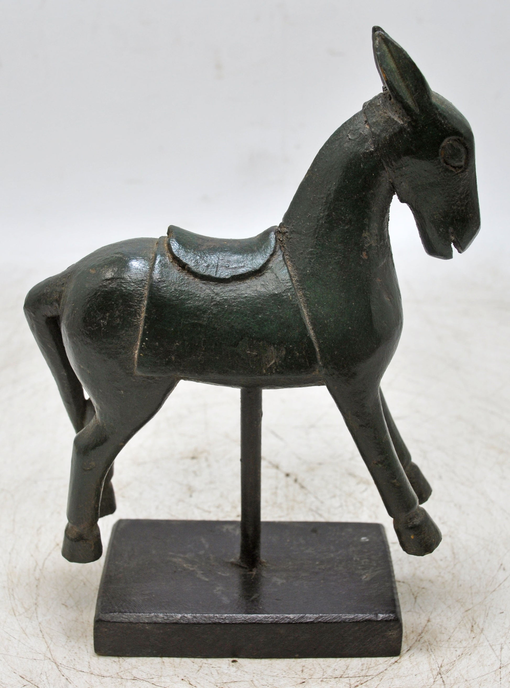 A traditional hand carved wooden horse figurine, shaped with balanced proportions and expressive detailing. The aged wood reveals a beautiful patina formed through years of natural use and handling. The carving remains crisp, and the overall condition is good, making this figurine a genuine example of Indian folk craftsmanship and decorative art.