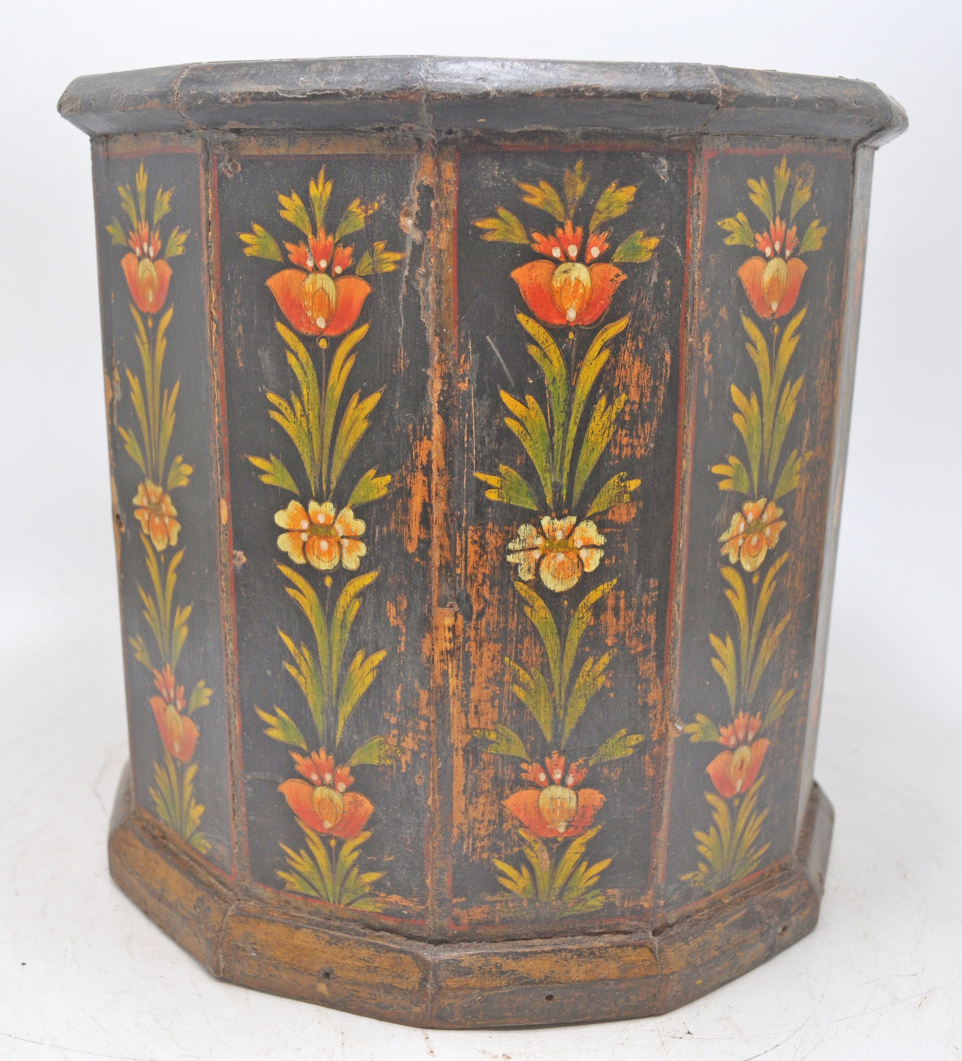 Expertly handcrafted in India, this vintage wooden octagonal planter pot showcases a beautiful original hand-painted design and a rich patina. Its exceptional craftsmanship and good condition make it a charming addition to any space.