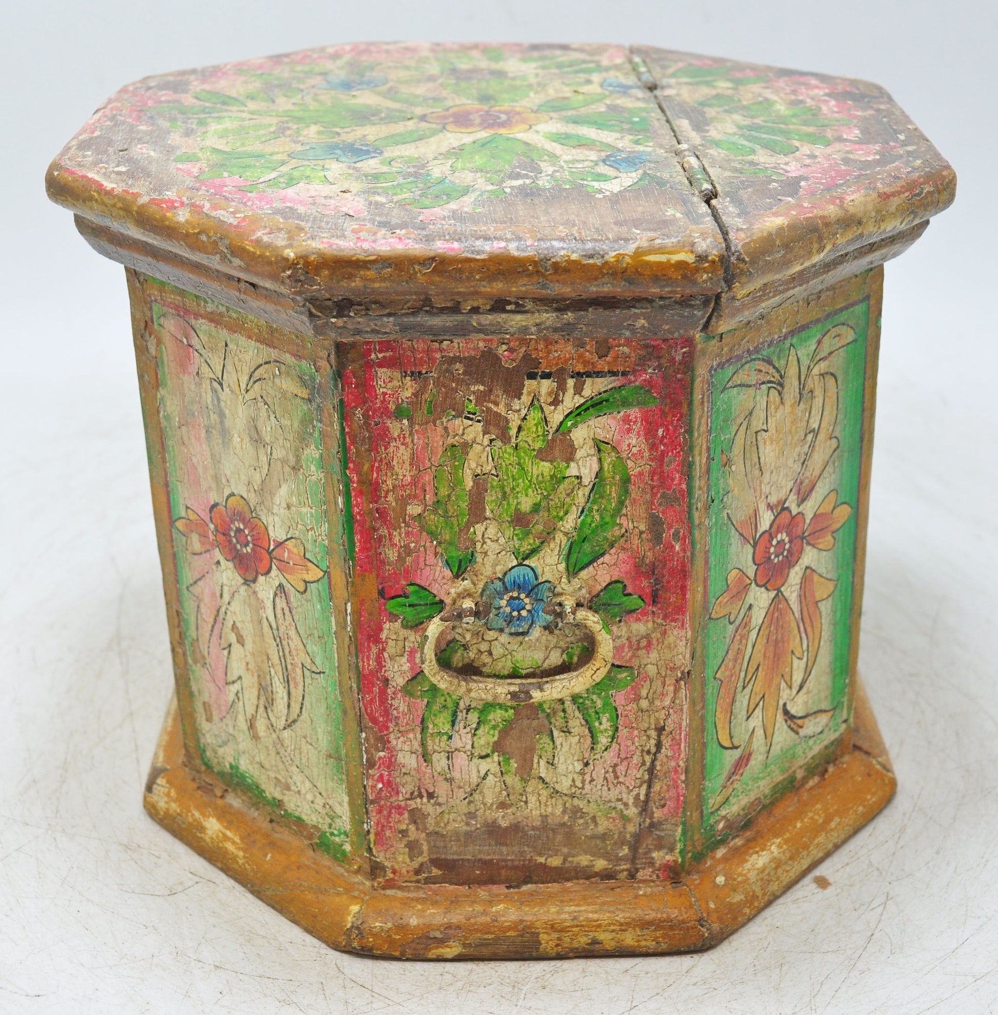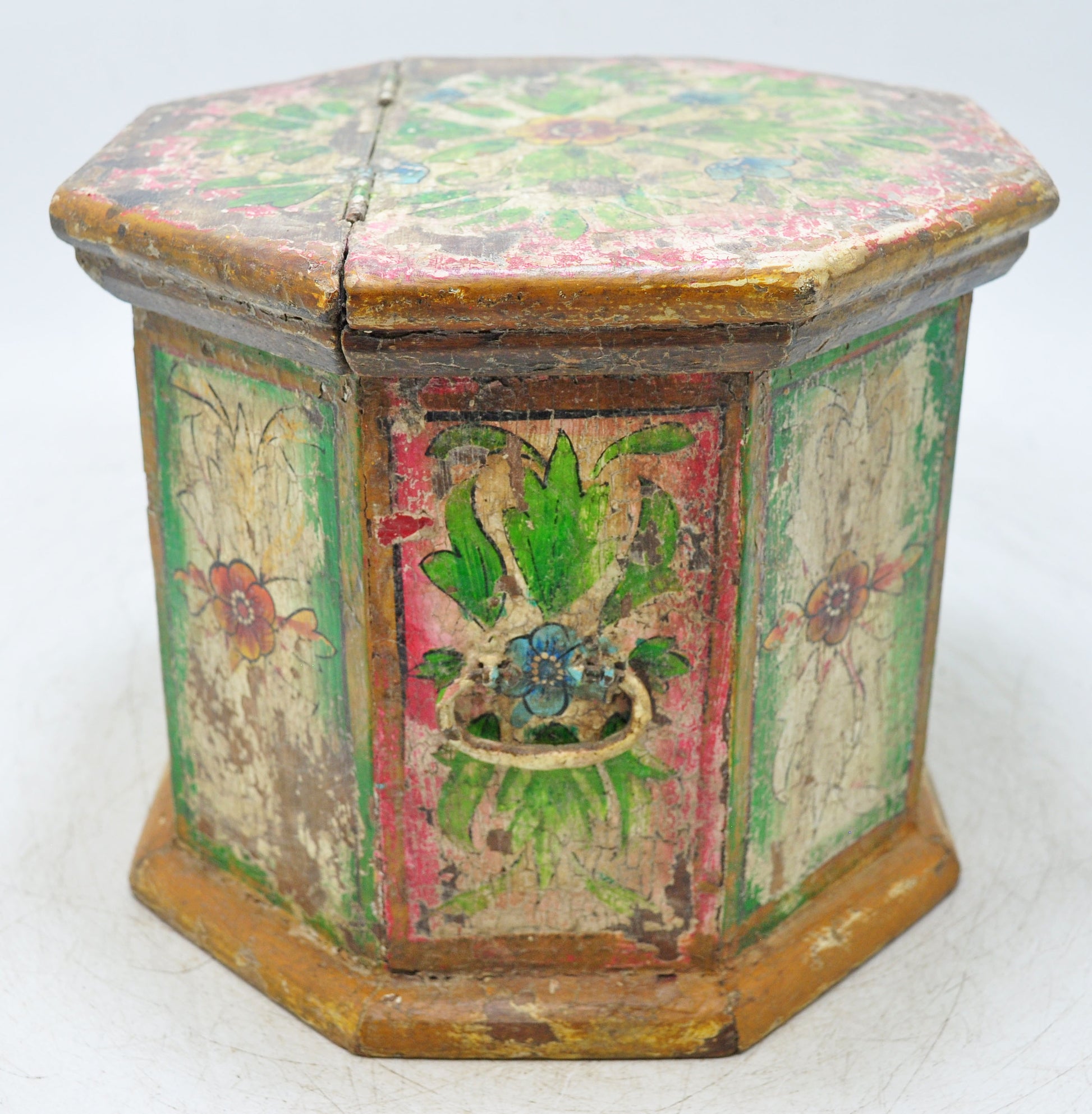 This old wooden octagonal storage box carries a striking vintage charm, shaped by hand into a balanced eight-sided form that reflects careful craftsmanship. Its surface is adorned with fine hand-painted work, adding character and cultural elegance to the piece. The wood has aged beautifully, developing a warm, rich patina that enhances its antique appeal. Still in good condition, this Indian box offers a lovely blend of artistry, function, and timeless decorative value.
