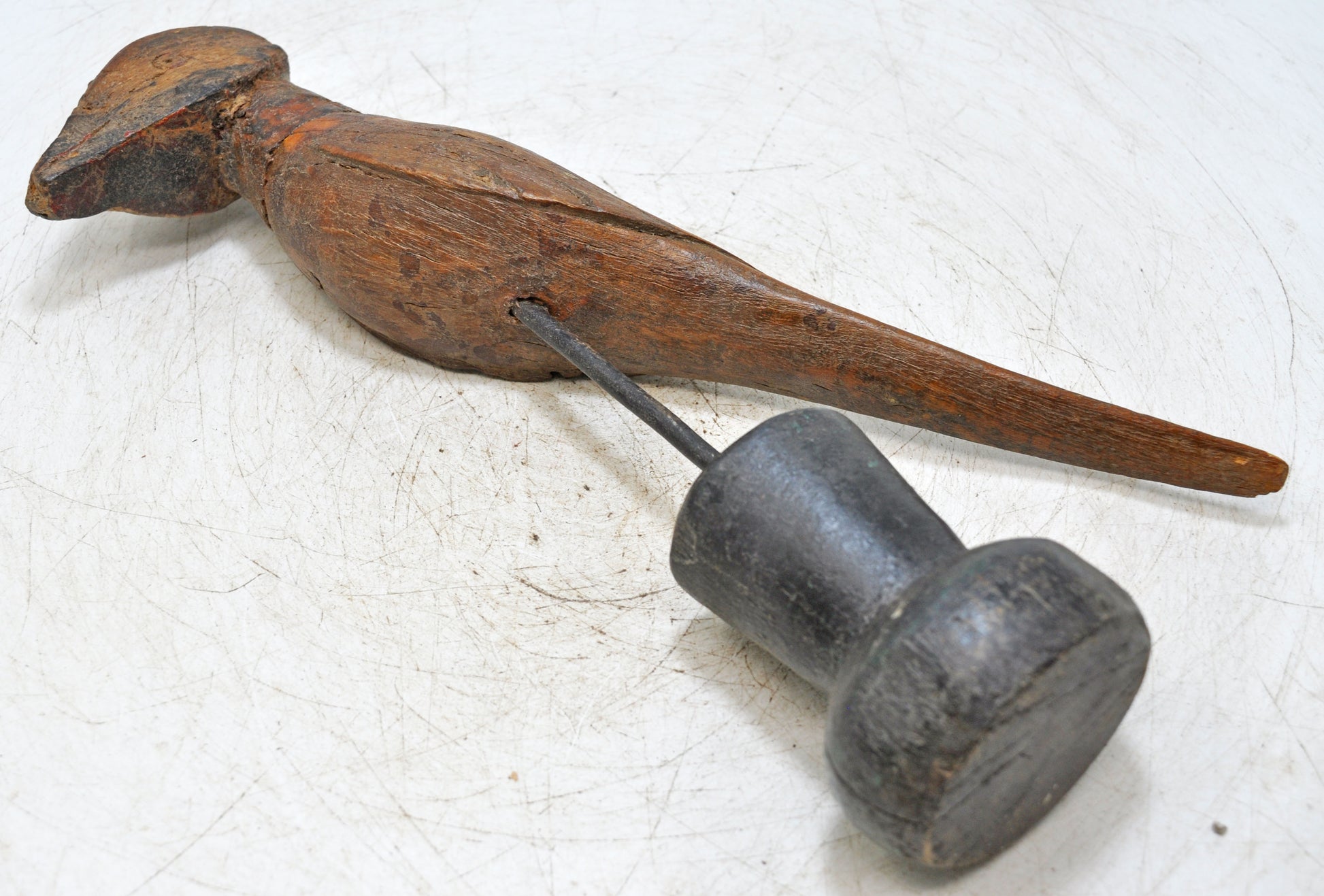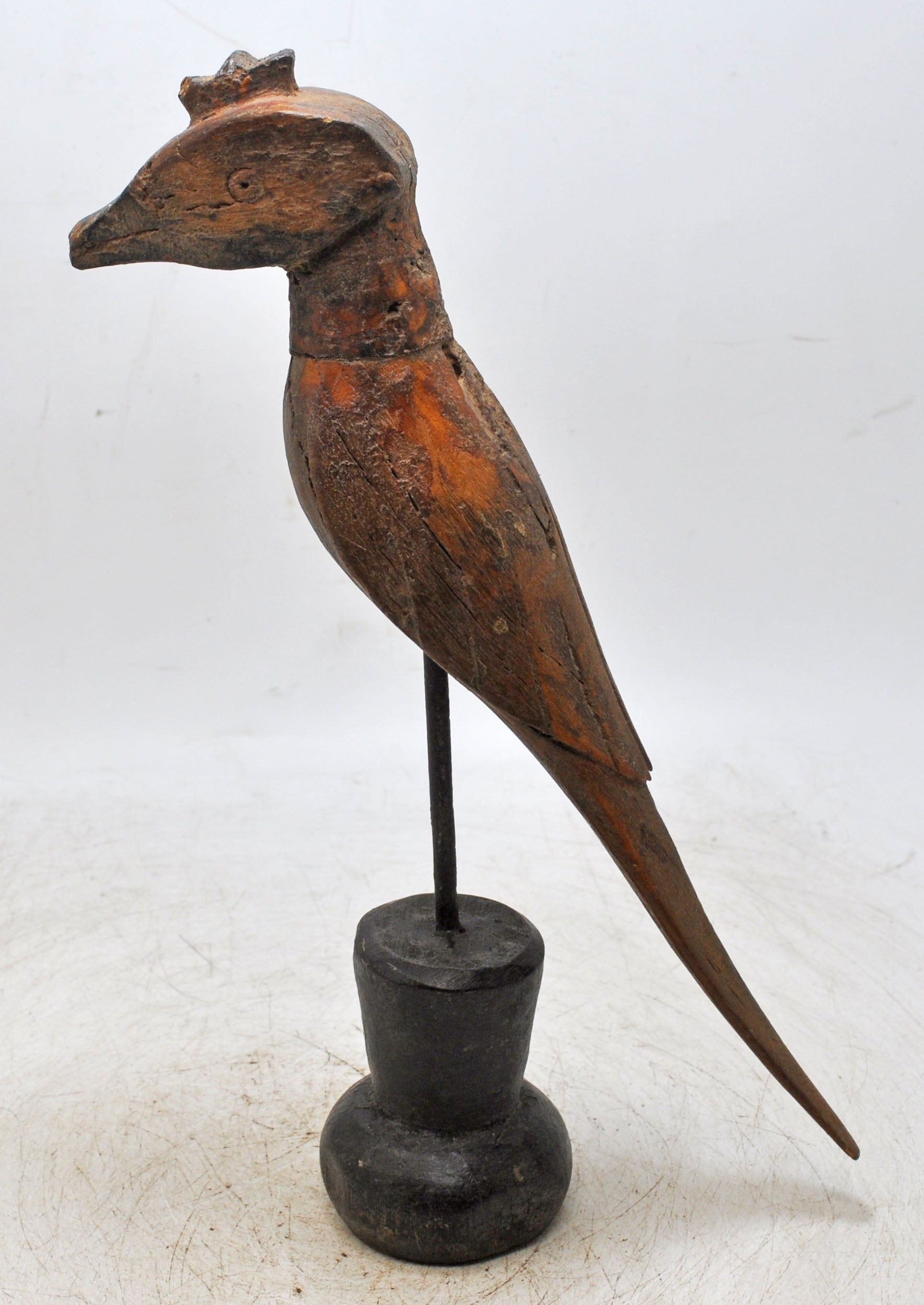 A finely crafted vintage Indian wooden bird, hand-carved with attention to intricate details and lifelike shape. The figurine’s rich patina emphasizes its age and cultural significance. Remaining in good condition, this piece offers both decorative appeal and collectible value, making it a timeless representation of traditional Indian craftsmanship and aesthetic charm.