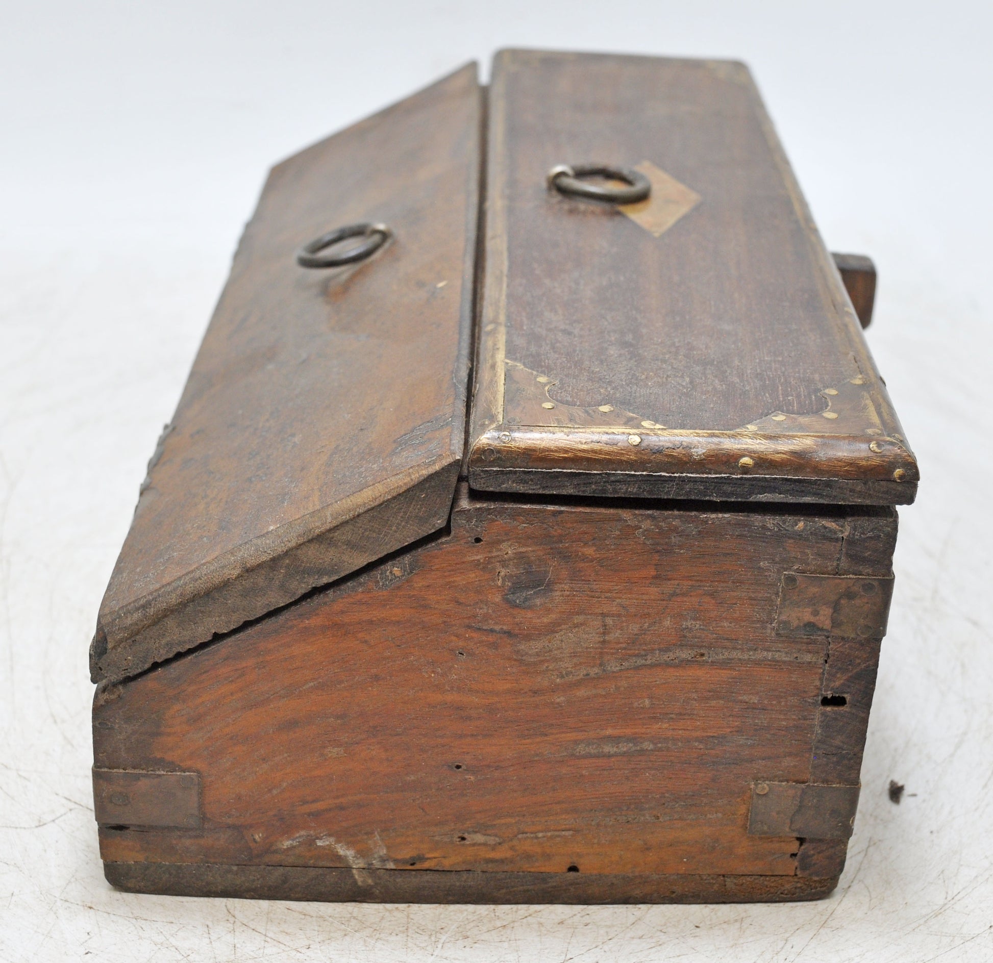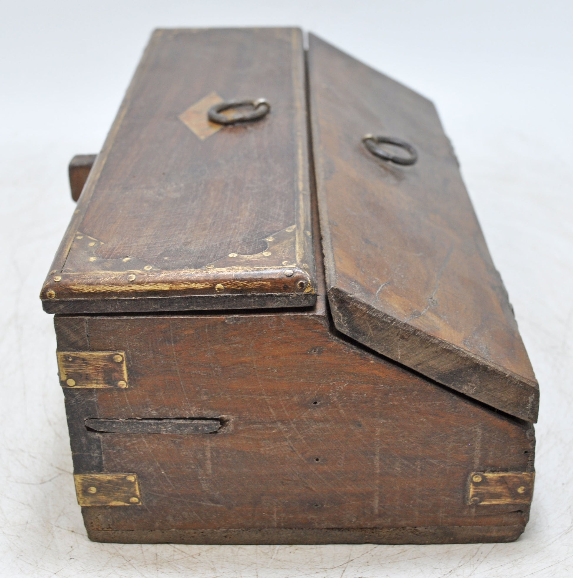 This charming antique wooden stationery box is skillfully hand-crafted in a distinctive, unique shape, featuring multiple compartments for organization. Its surface is enhanced with brass decorations that lend elegance and vintage appeal. Preserved in good condition, the box has developed a warm, rich patina over time. Originating from India, it exemplifies traditional craftsmanship with functional artistry.