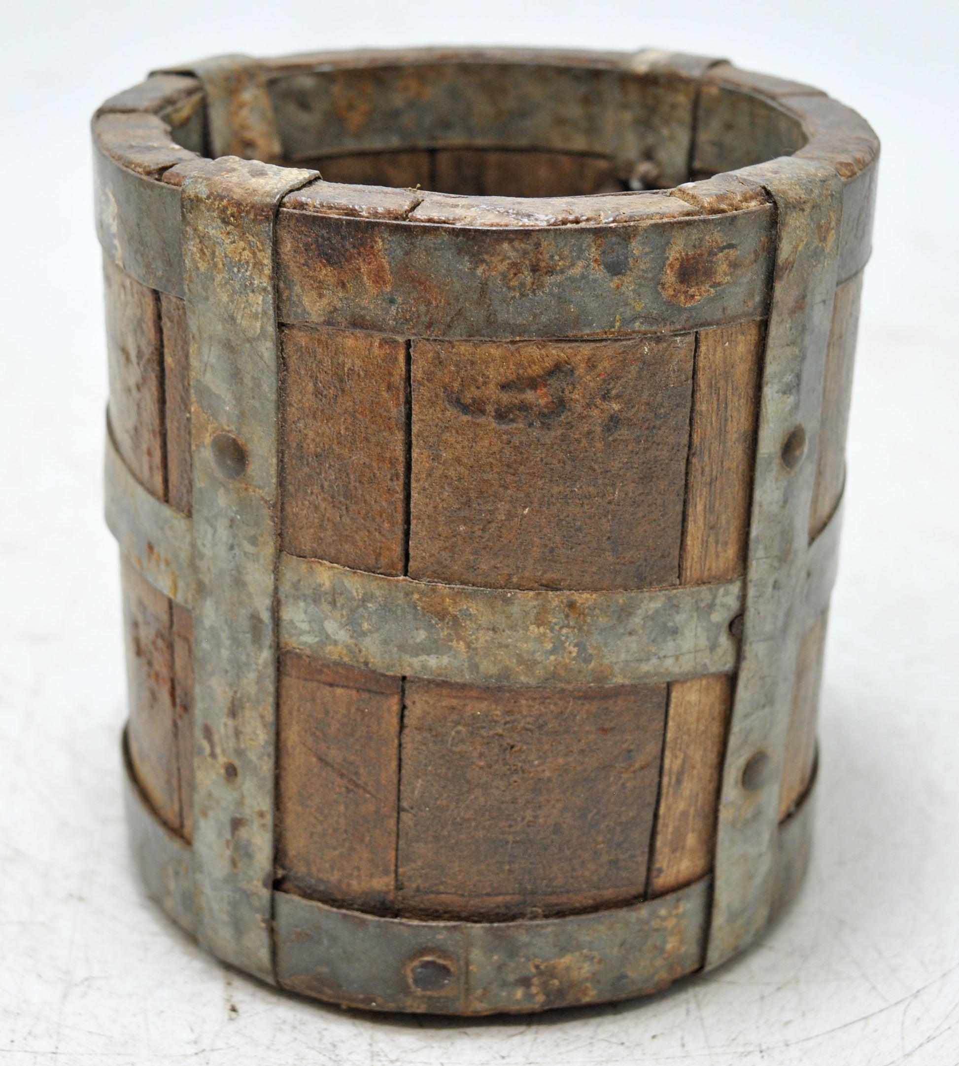 Enhance your space with this lovely old wooden round pot. Handcrafted in India, its distinctive shape and metal detailing highlight its past as a grain measure. Its good condition and rich patina make it a unique and appealing decorative piece.