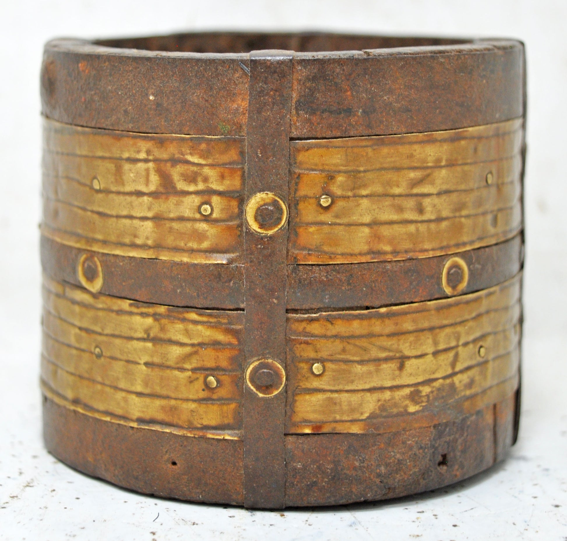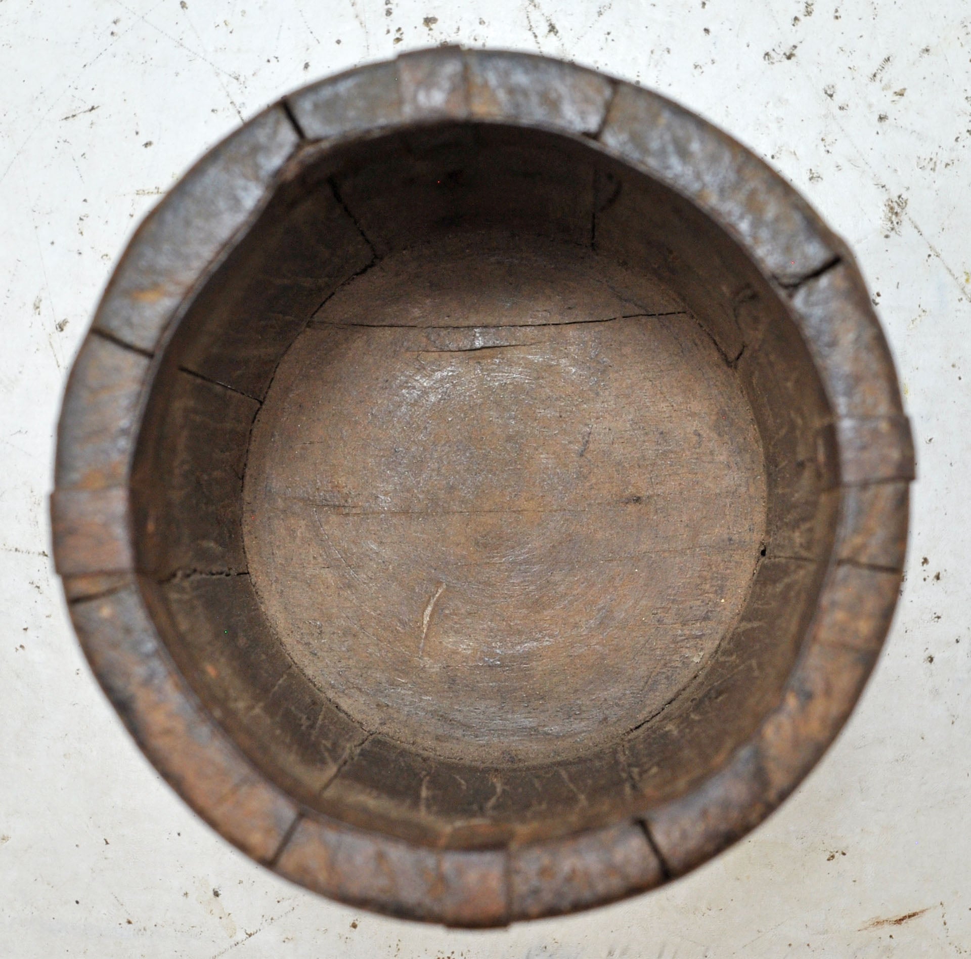 A nice looking old wooden small round pot, originally used for measuring grains. Hand crafted in a nice shape. Good condition and a rich patina. Origin India.