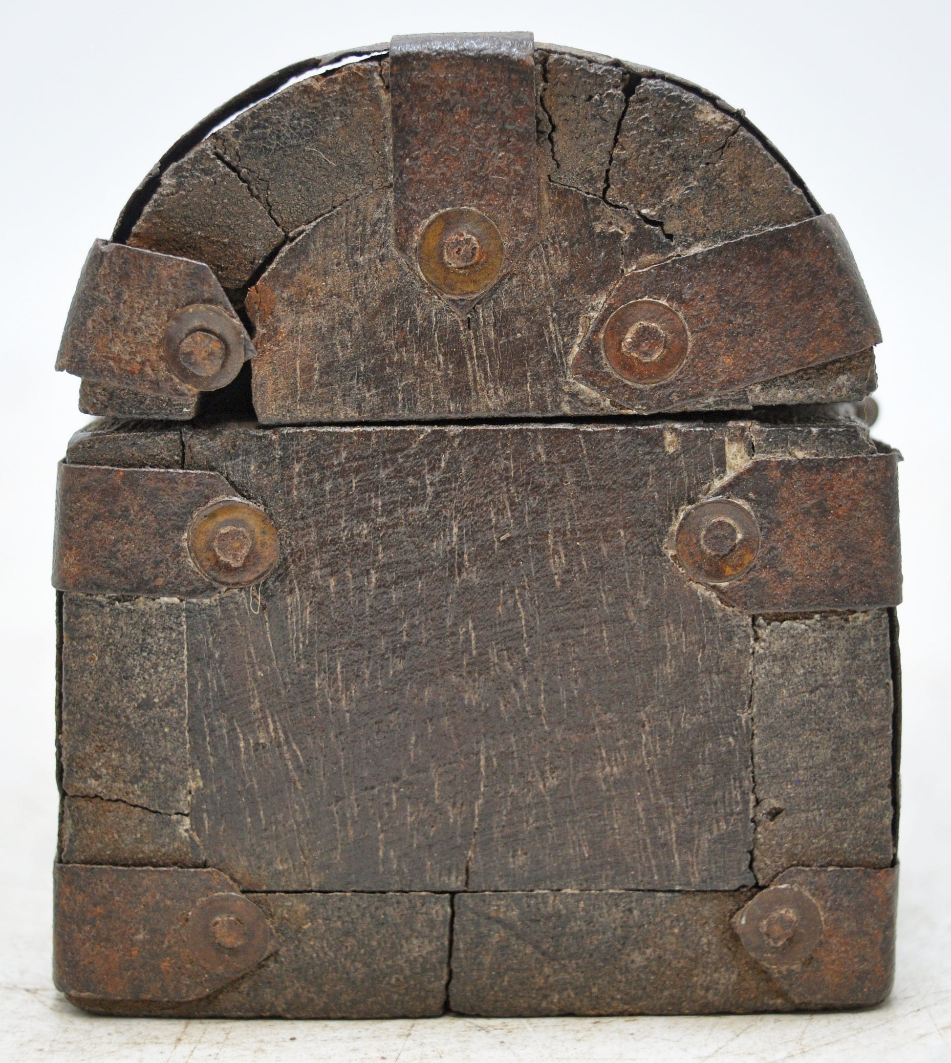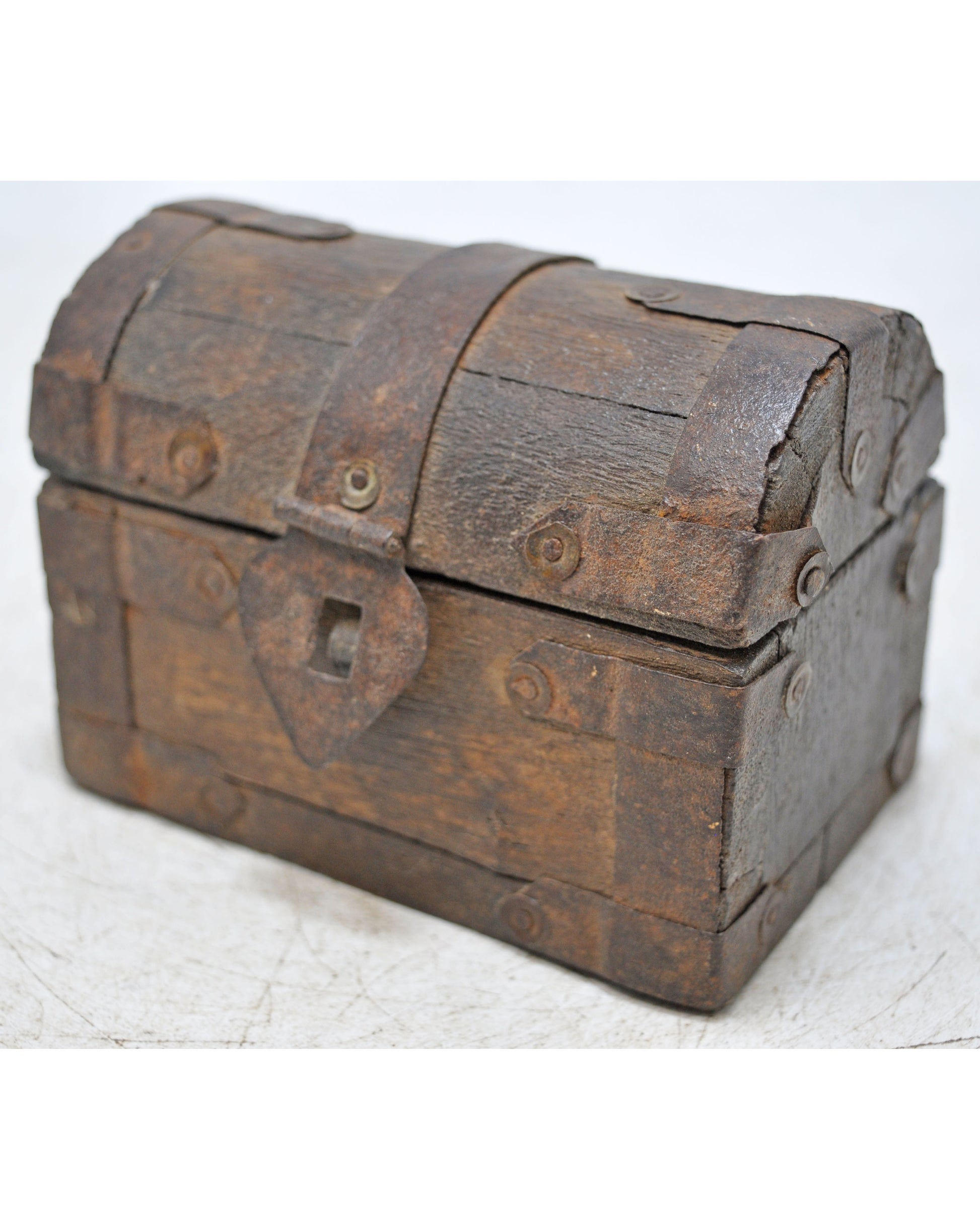 This is a nice looking old wooden small storage box. It was hand crafted in India. It has a half round top and metal fitted on wood. It is in good condition and has a rich patina.