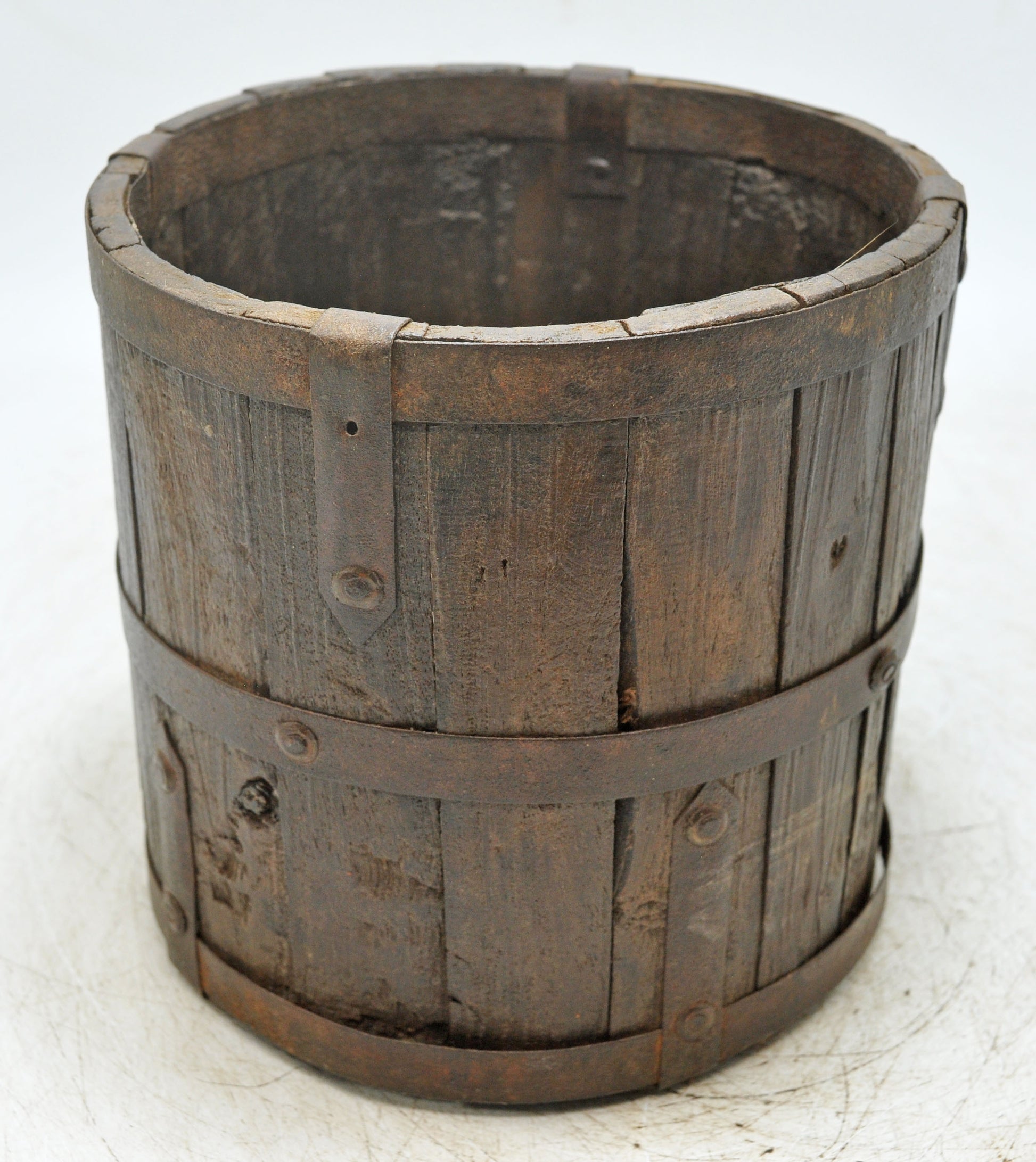 This antique round wooden planter pot has been shaped entirely by hand, giving it a solid and harmonious appearance. Metal elements fitted onto the wood enhance its visual interest and durability. The wood carries a rich patina formed over time, highlighting its vintage charm. Remaining in good overall condition, this planter originates from India and offers timeless rustic appeal.