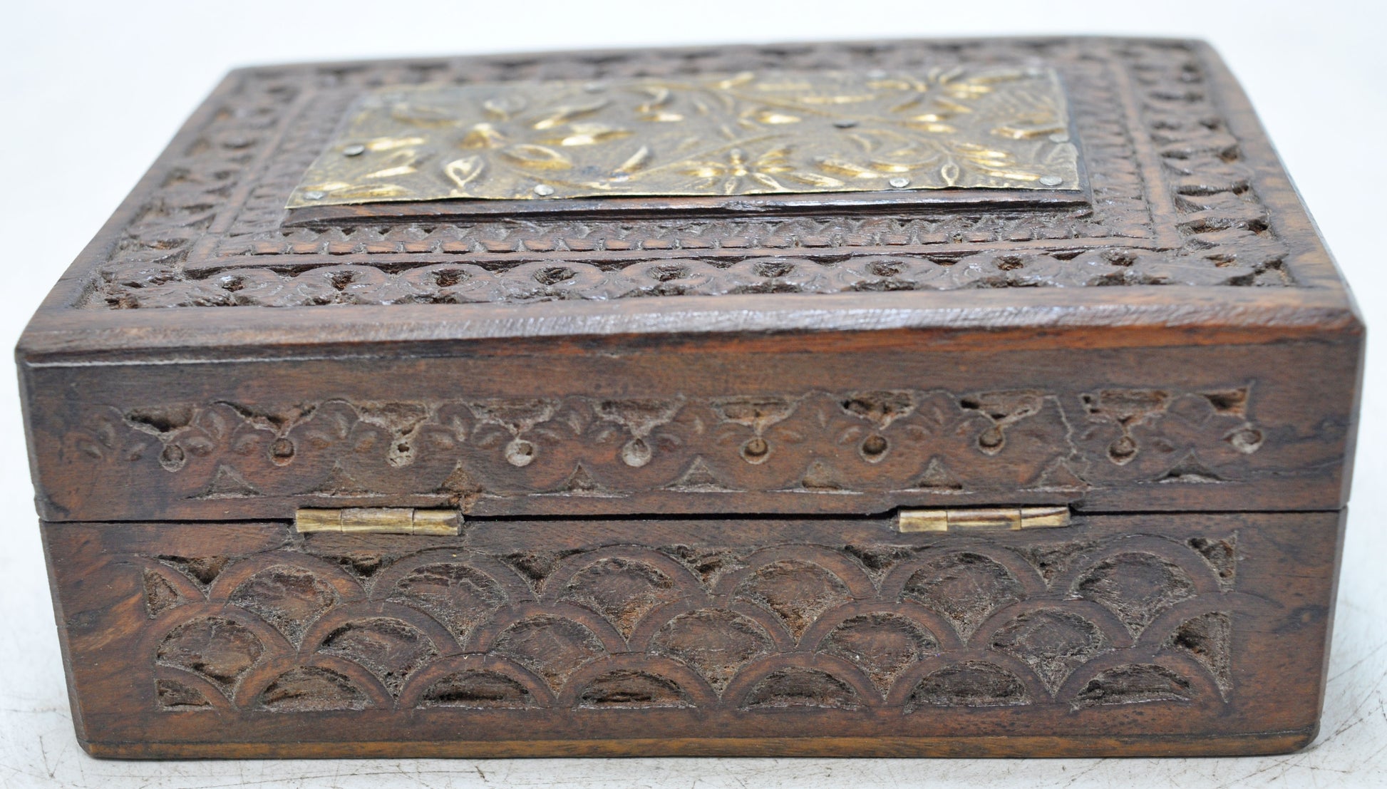 Vintage Wooden Small Storage Box Original Old Hand Carved Metal Fitted