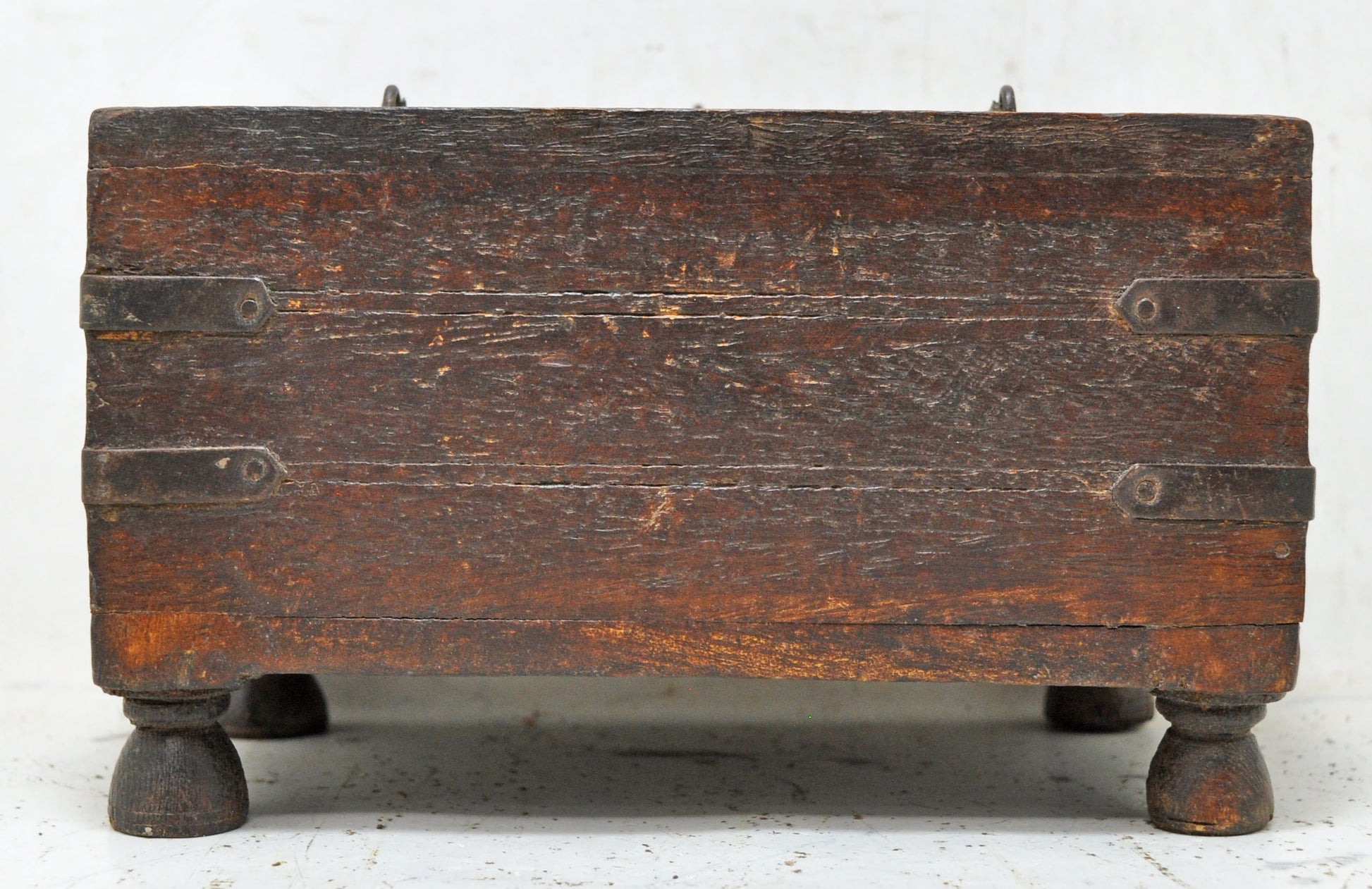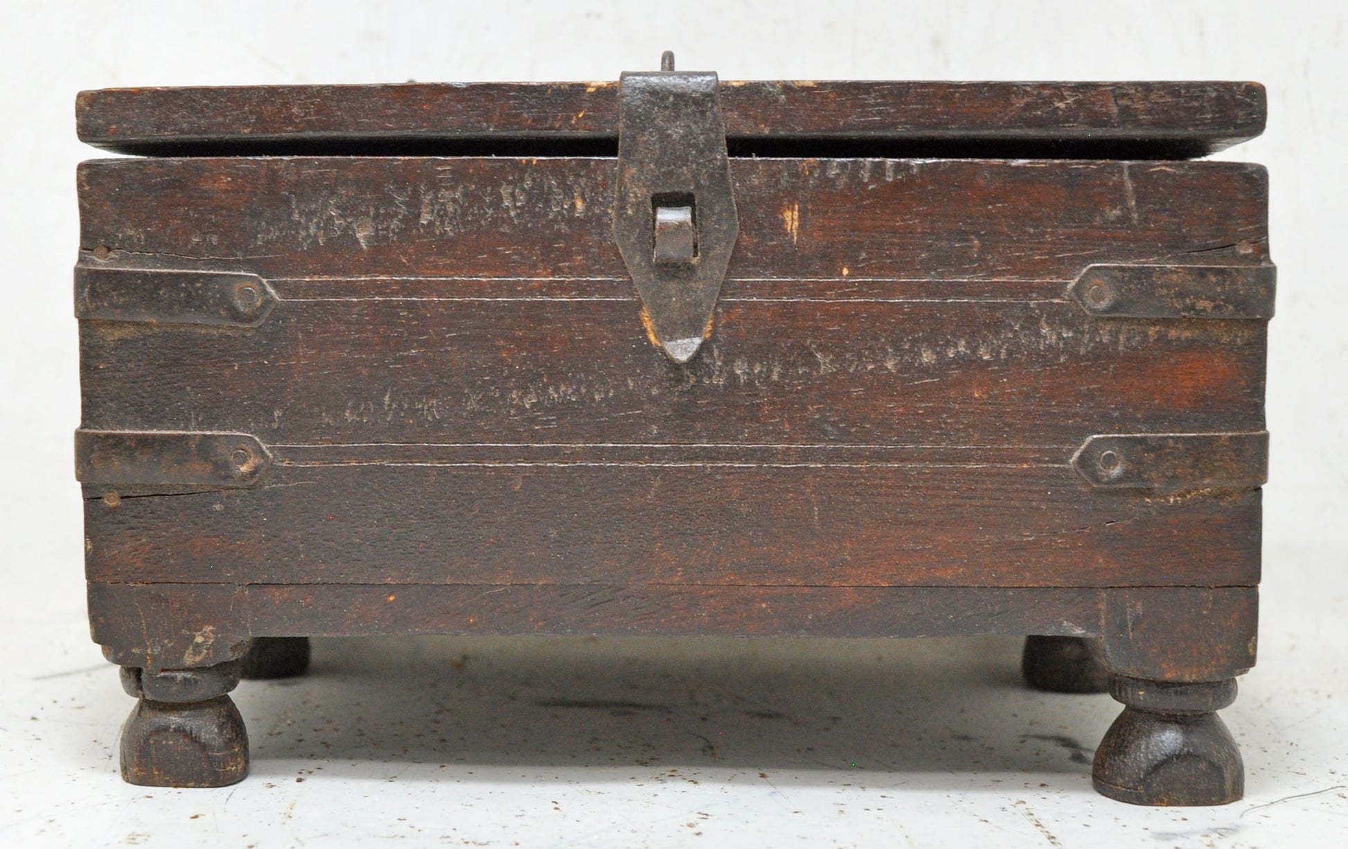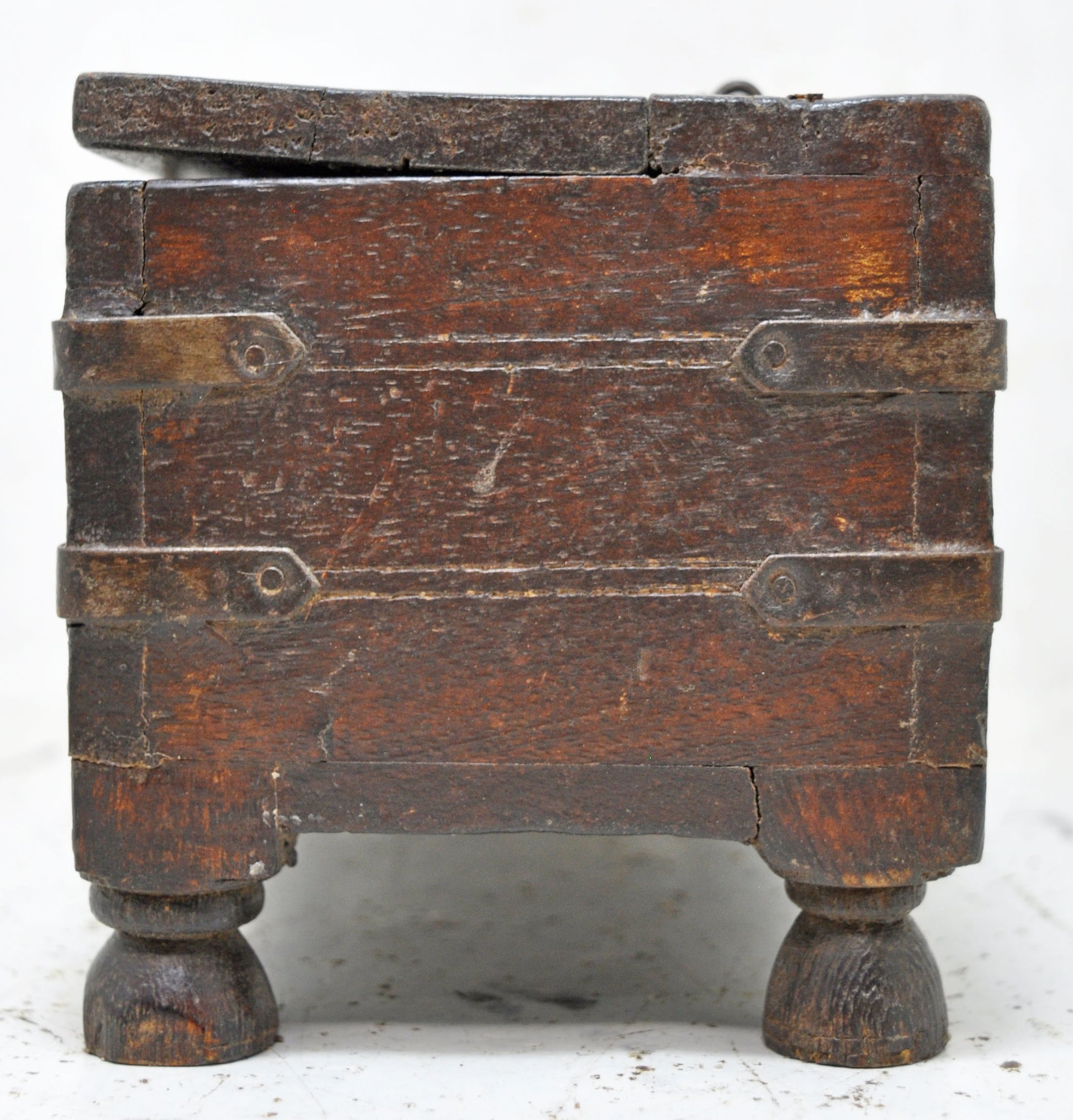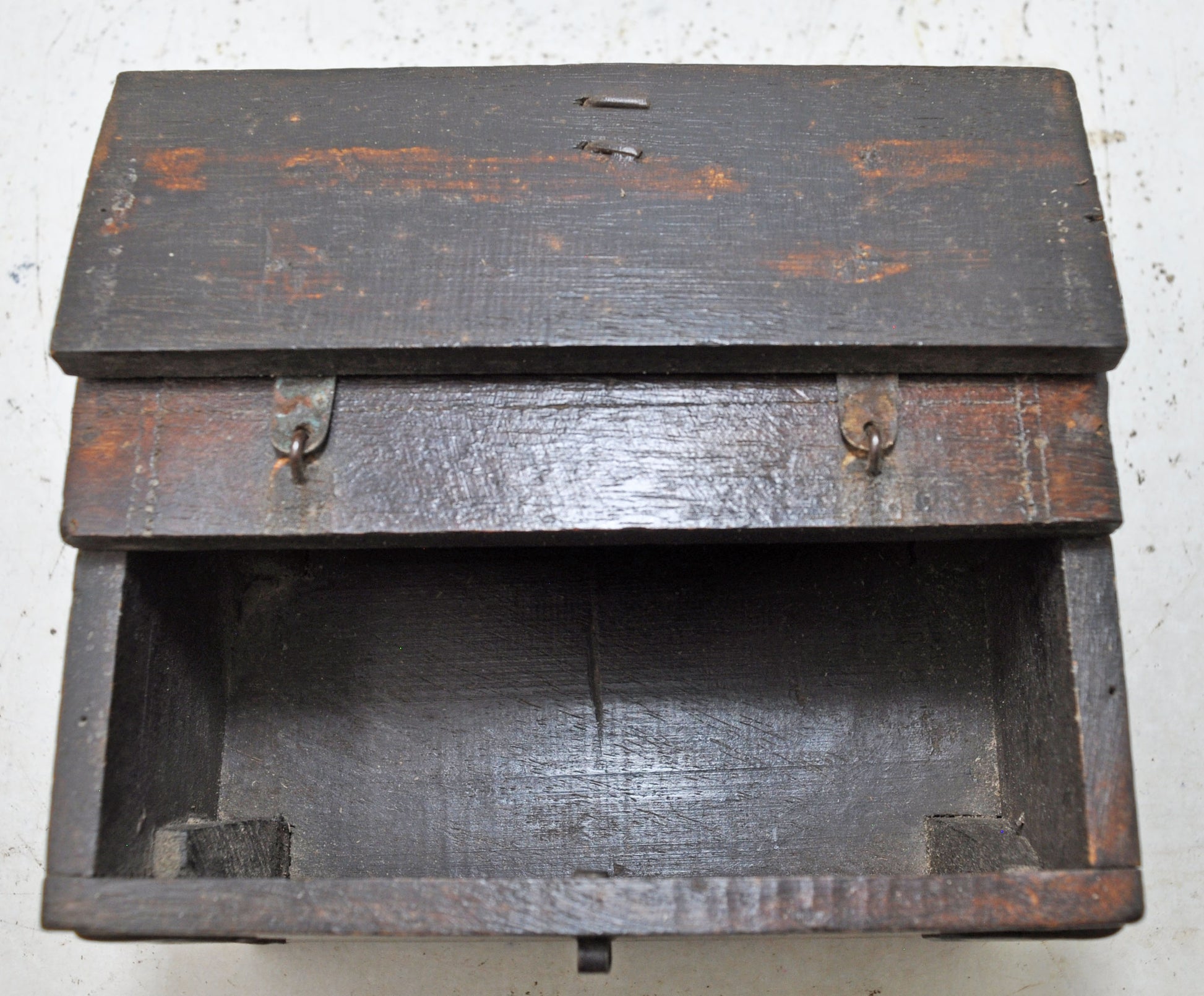 A nice looking old wooden small storage box. Hand crafted in a nice shape. Good condition and a rich patina. Origin India.