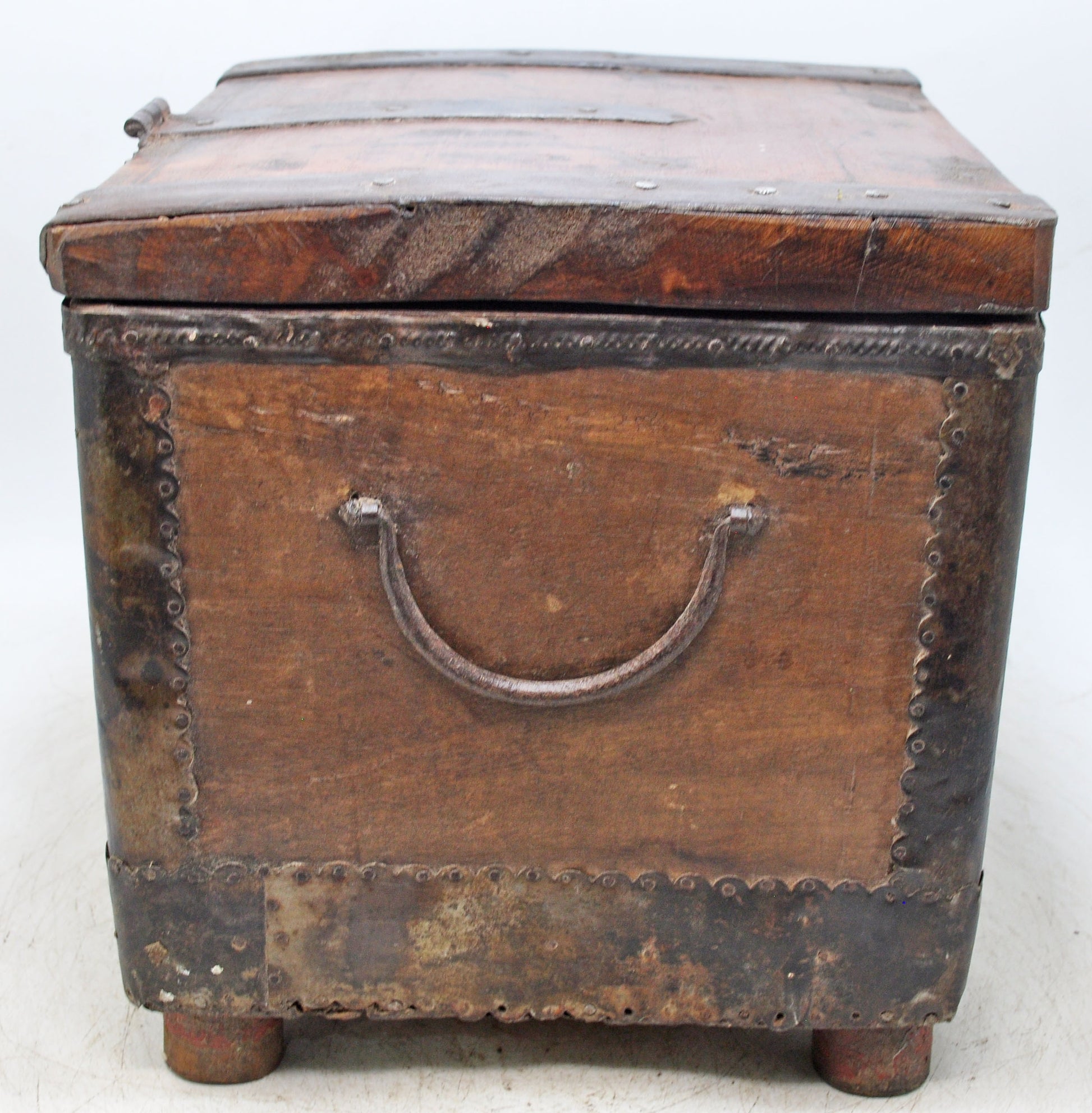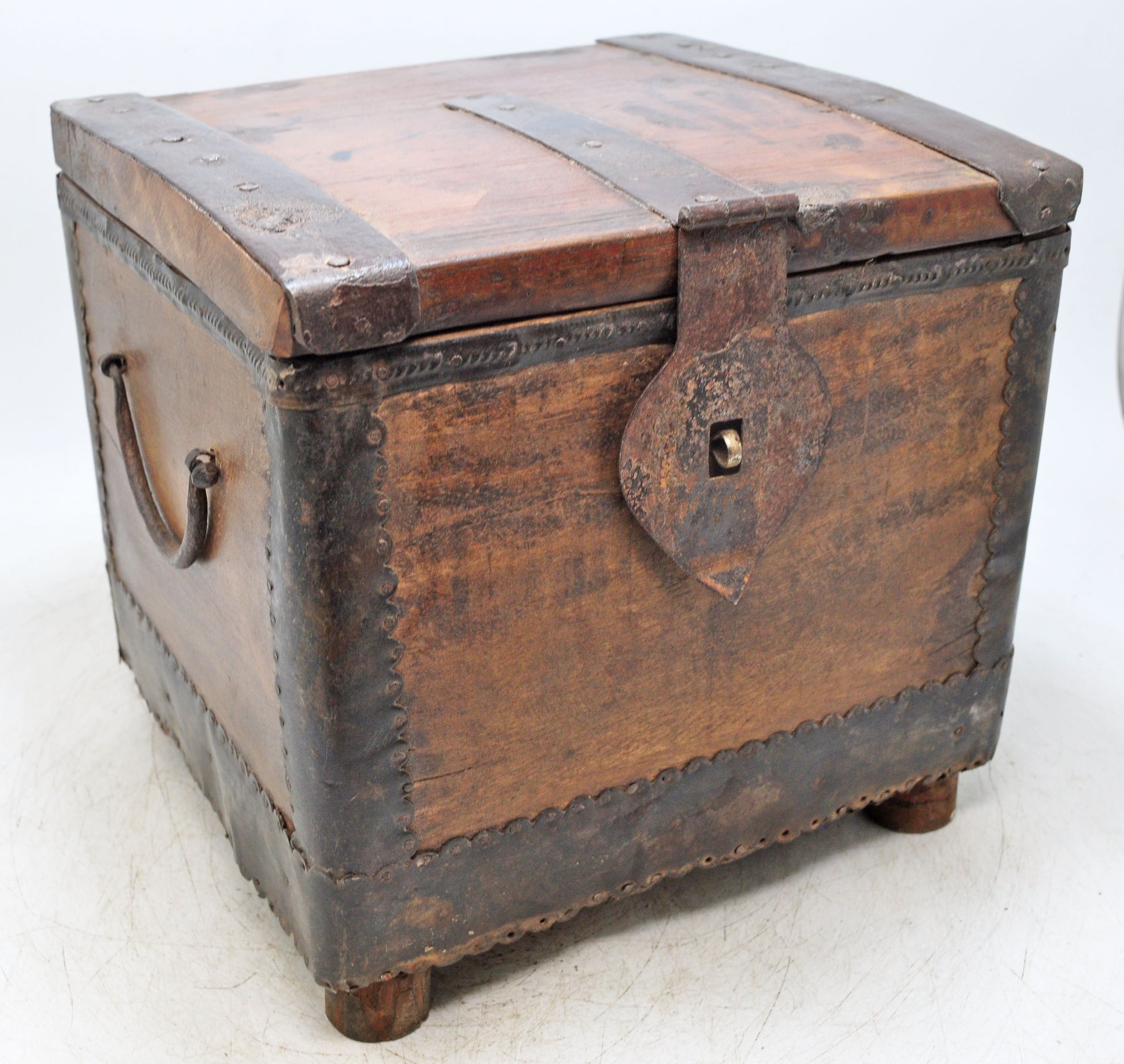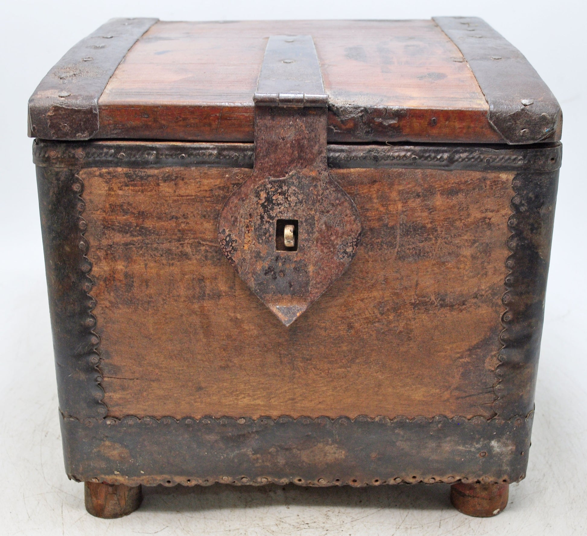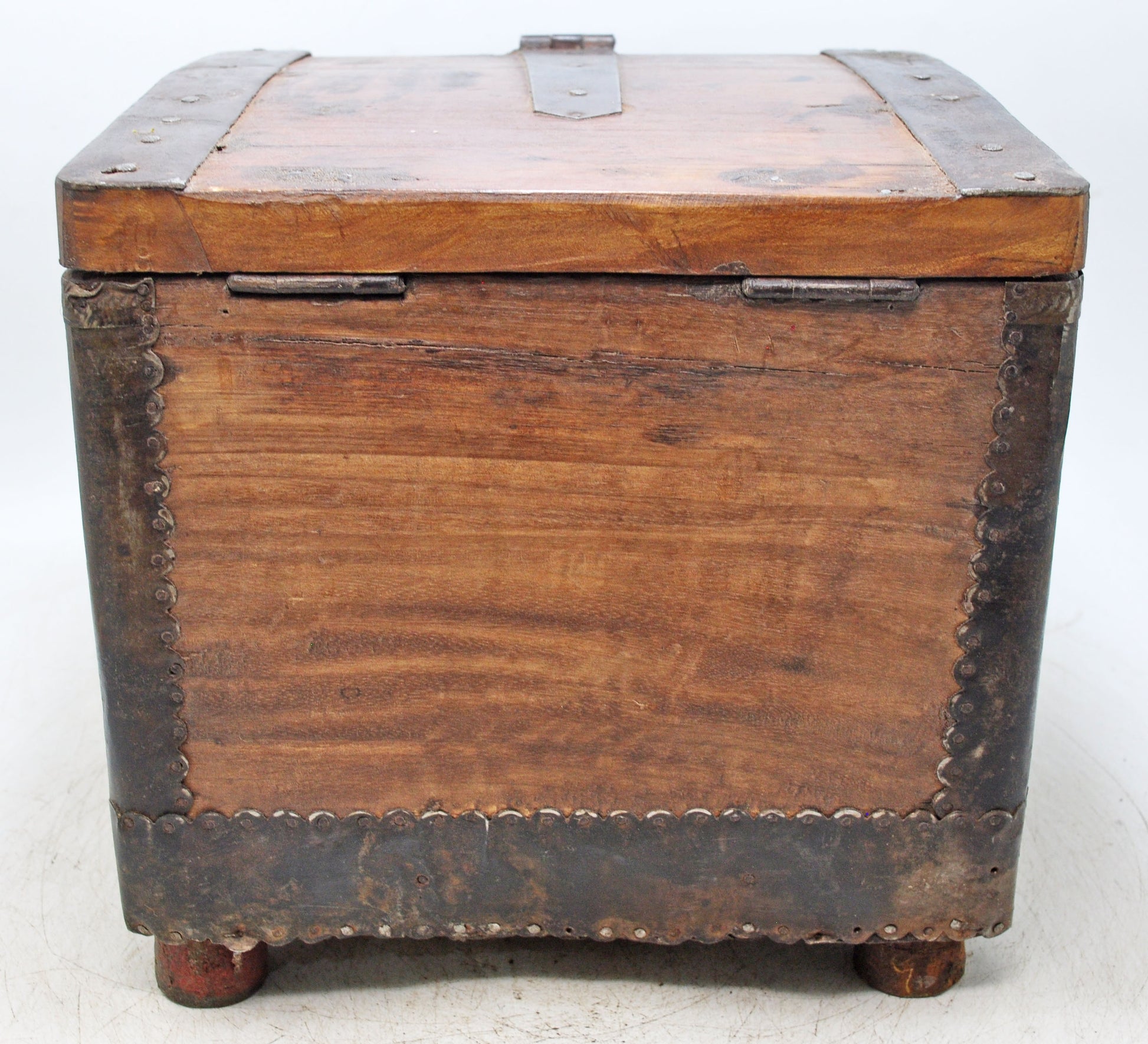 An old wooden chest box, square in form and shaped entirely by hand, showcasing classic workmanship. Metal fittings add strength and decorative appeal, giving the piece a timeless rustic look. The wood carries a rich, aged patina that has developed gradually over time, adding depth and visual warmth. In good condition, it remains sturdy and functional. From India, it brings history, character, and vintage charm to any interior.