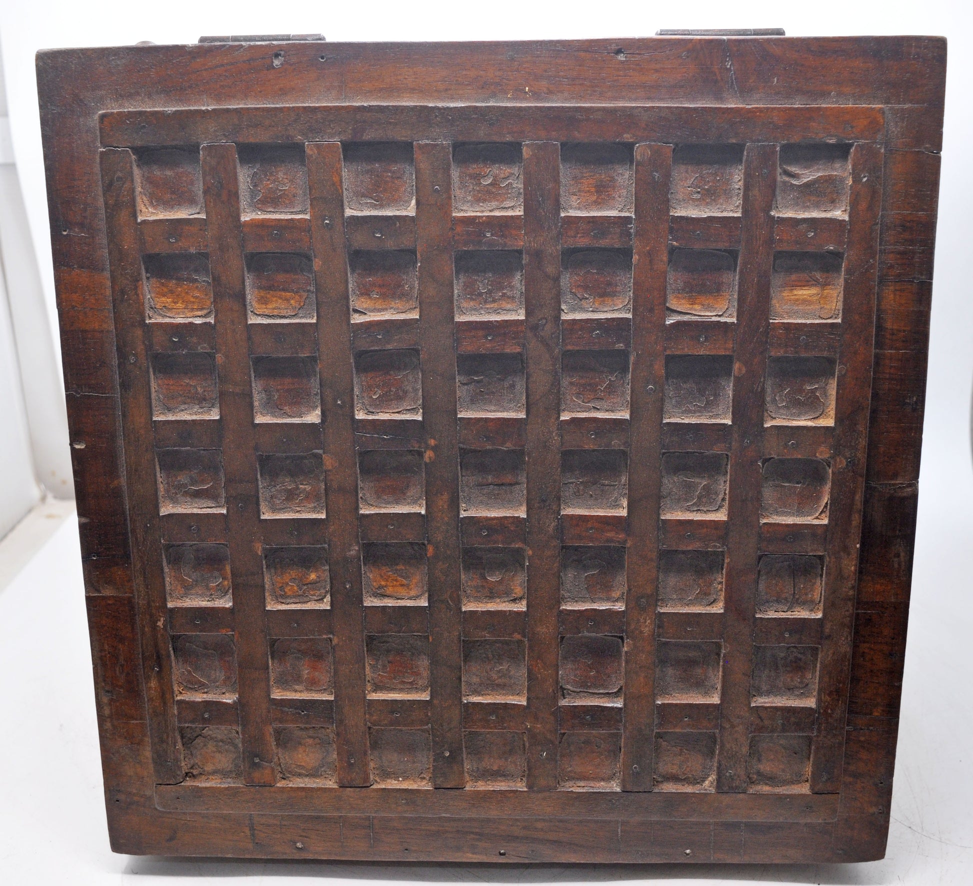 An exceptional vintage wooden chest, masterfully crafted in India. Its distinctive silhouette is enhanced by the addition of striking brass fittings. The piece has a lovely, well-preserved character and a lustrous patina from age, all while remaining in very good condition.