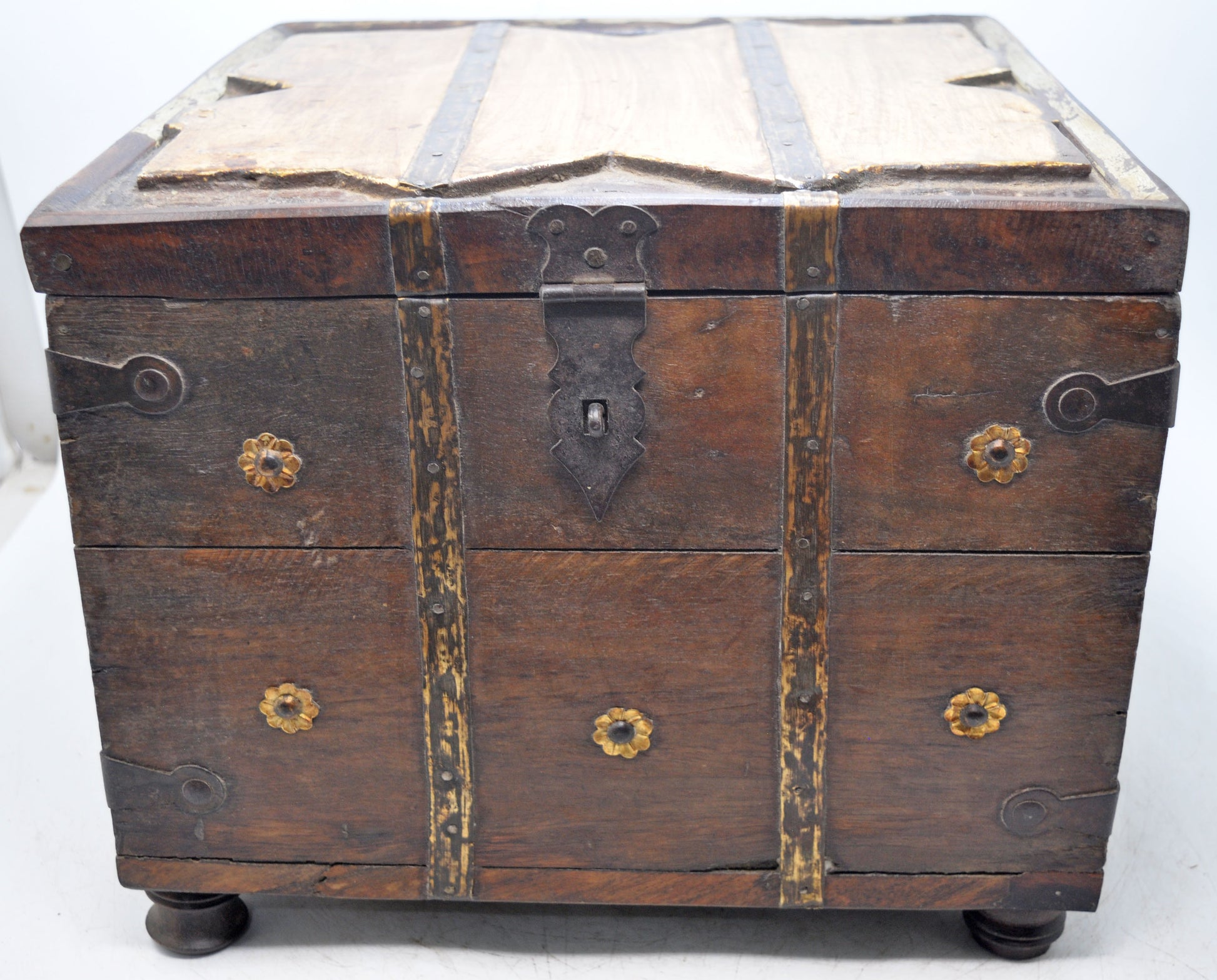 Handcrafted in India, this lovely old wooden storage box is a testament to traditional artistry. The unique form and decorative metalwork complement the rich patina of the wood, which tells a story of its age. A perfect piece for adding a touch of authentic vintage charm to any space.