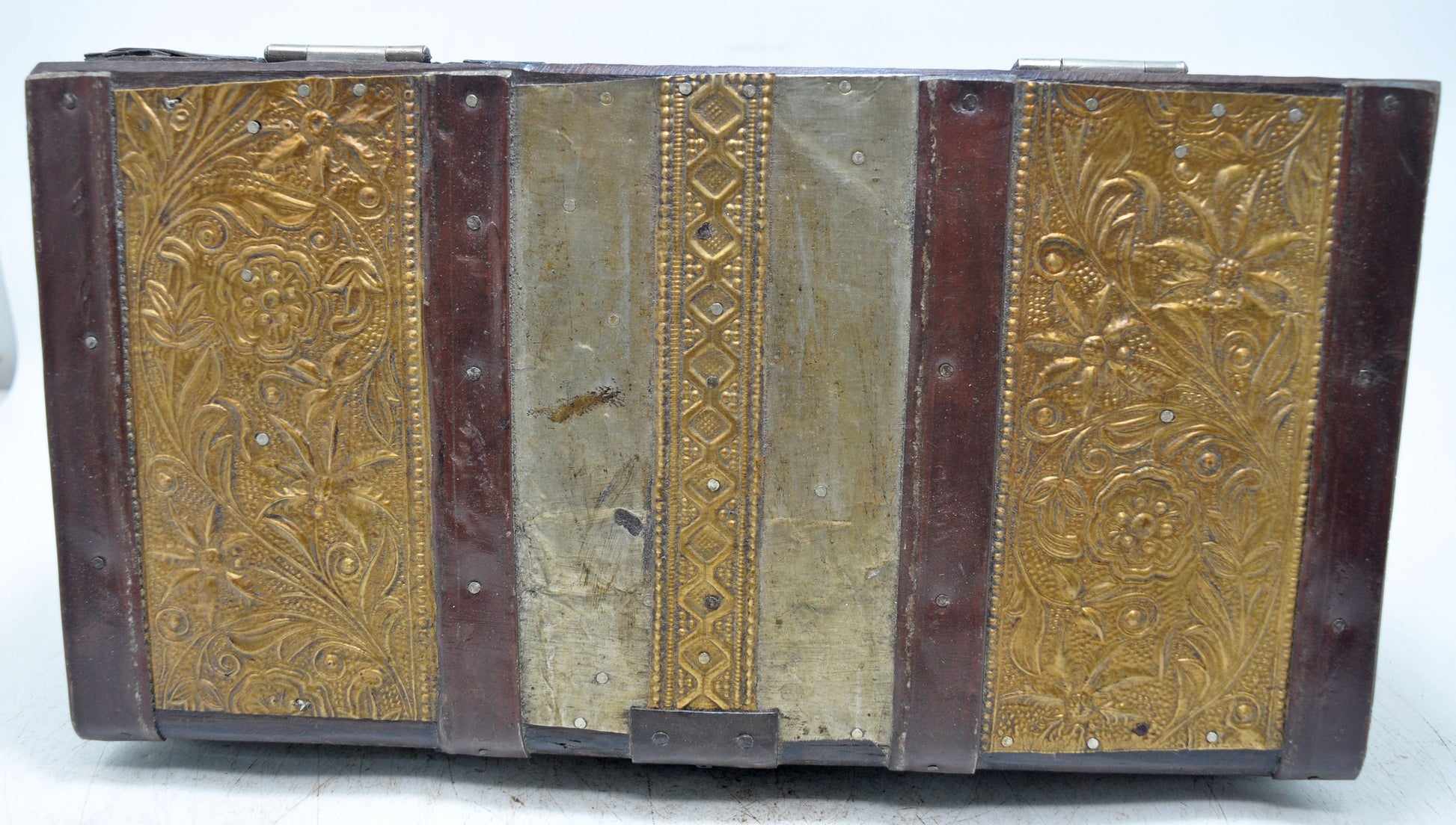 An authentic vintage wooden storage chest from India, carefully made by hand and showcasing the skill of old artisans. The box is adorned with decorative iron and brass fittings, adding strength and beauty to the design. Over time, the surface has developed a rich, natural patina that reflects its long history. This chest is both sturdy and charming, making it suitable for antique collectors, rustic interiors, or as a decorative display. Good condition throughout.